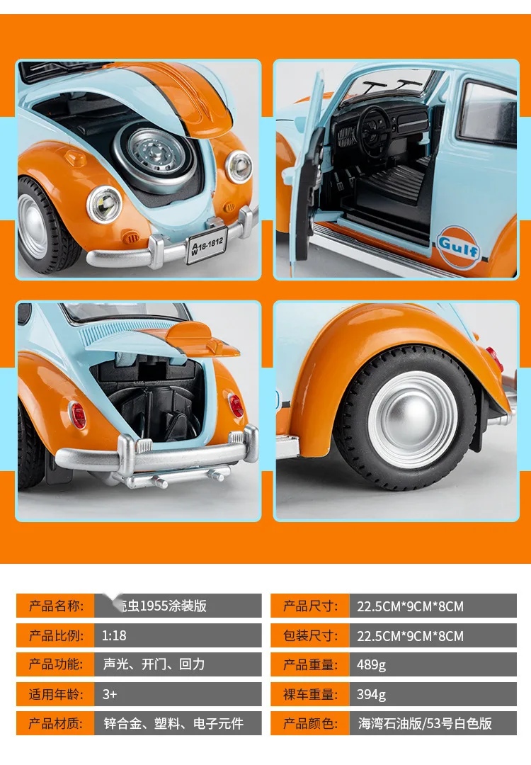 Immerse yourself in nostalgic charm with this beautifully crafted 1:18 scale diecast alloy model of the 1955 Volkswagen Beetle. Featuring a smooth, rounded body painted in soft light blue with vibrant orange accents, this miniature captures iconic vintage details. The bold black stripe adds a dynamic contrast, while the large, rounded headlights with clear lenses emit a bright white glow. Silver-colored bumper and hubcaps enhance its classic appeal, complemented by textured black tires. Transparent windows reveal a detailed interior, making the model more lifelike. Its multi-functional features, including flashing lights and sound/vocal effects, offer an engaging display. Perfect for collectors or as a lively decorative piece, this model exudes timeless, playful automotive elegance and vintage personality.