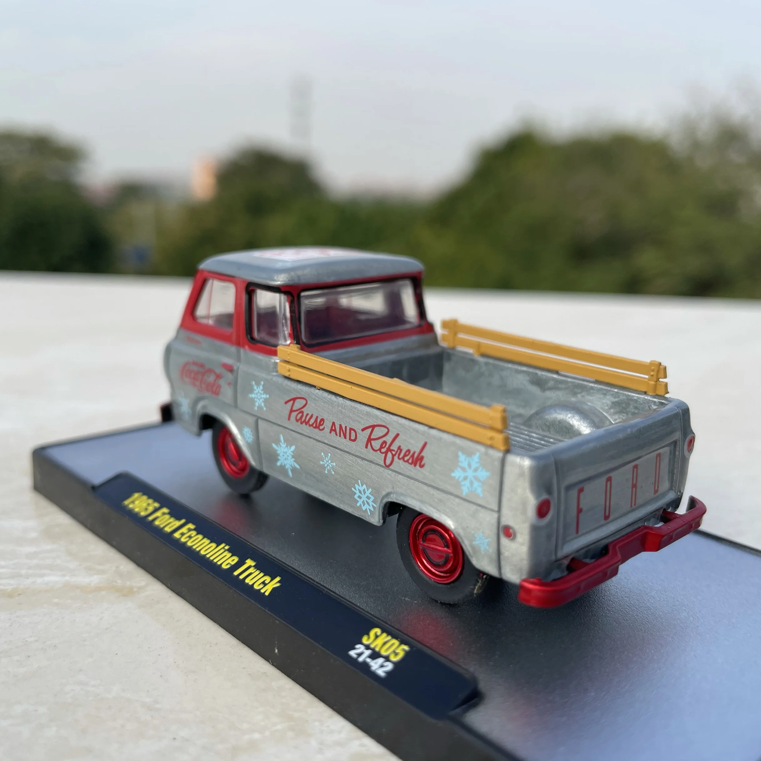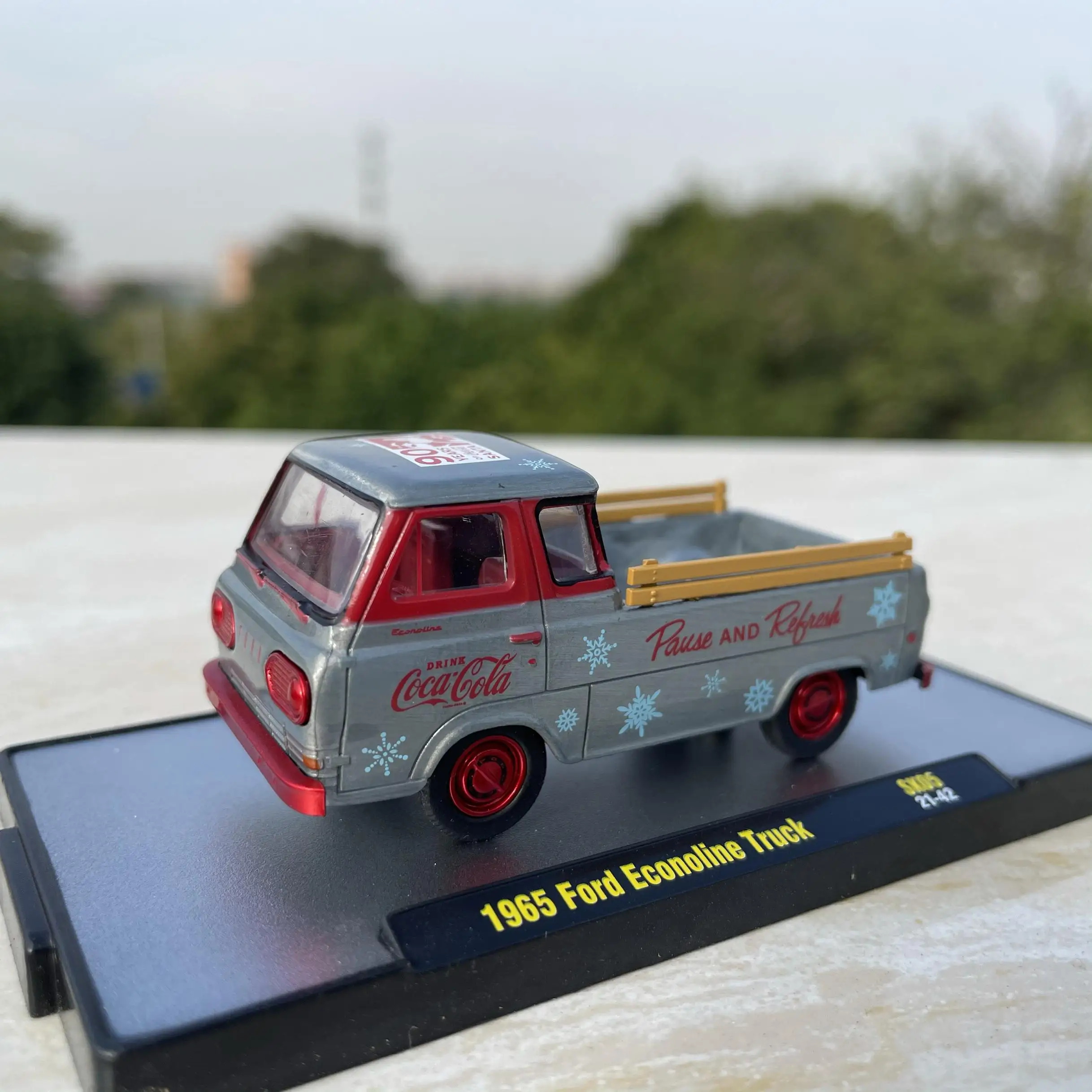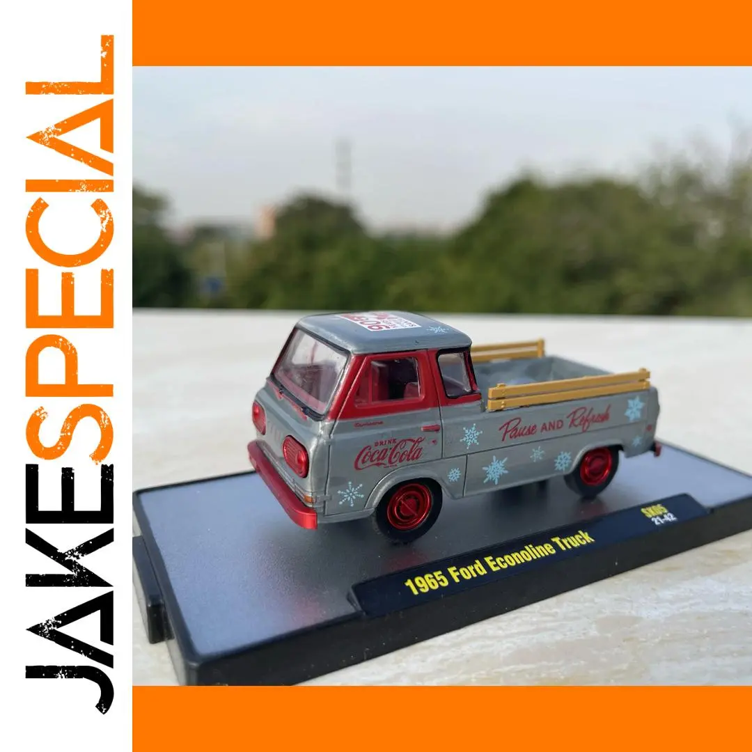 Experience the nostalgic charm of this highly detailed 1:64 scale diecast model of the iconic 1965 Ford Econoline Pickup Truck. Perfect for collectors or enthusiasts, this replica captures the vintage aesthetic with a sleek metallic silver body accented with bold red elements. The vehicle features a gently curved windshield, rounded cab, and subtle boxy contours reflective of 1960s styling. Clear plastic windows reveal a simplified yet detailed interior, including visible seating and dashboard elements. The front grille and headlight inserts are delicately painted red, complemented by a contrasting red bumper. The cargo bed showcases classic branding, with red “Coca-Cola” logos, a “Pause and Refresh” slogan, and blue snowflake decorations, evoking a retro, vintage vibe. Vibrant yellow side rails add lively color accents, making this model a standout piece.