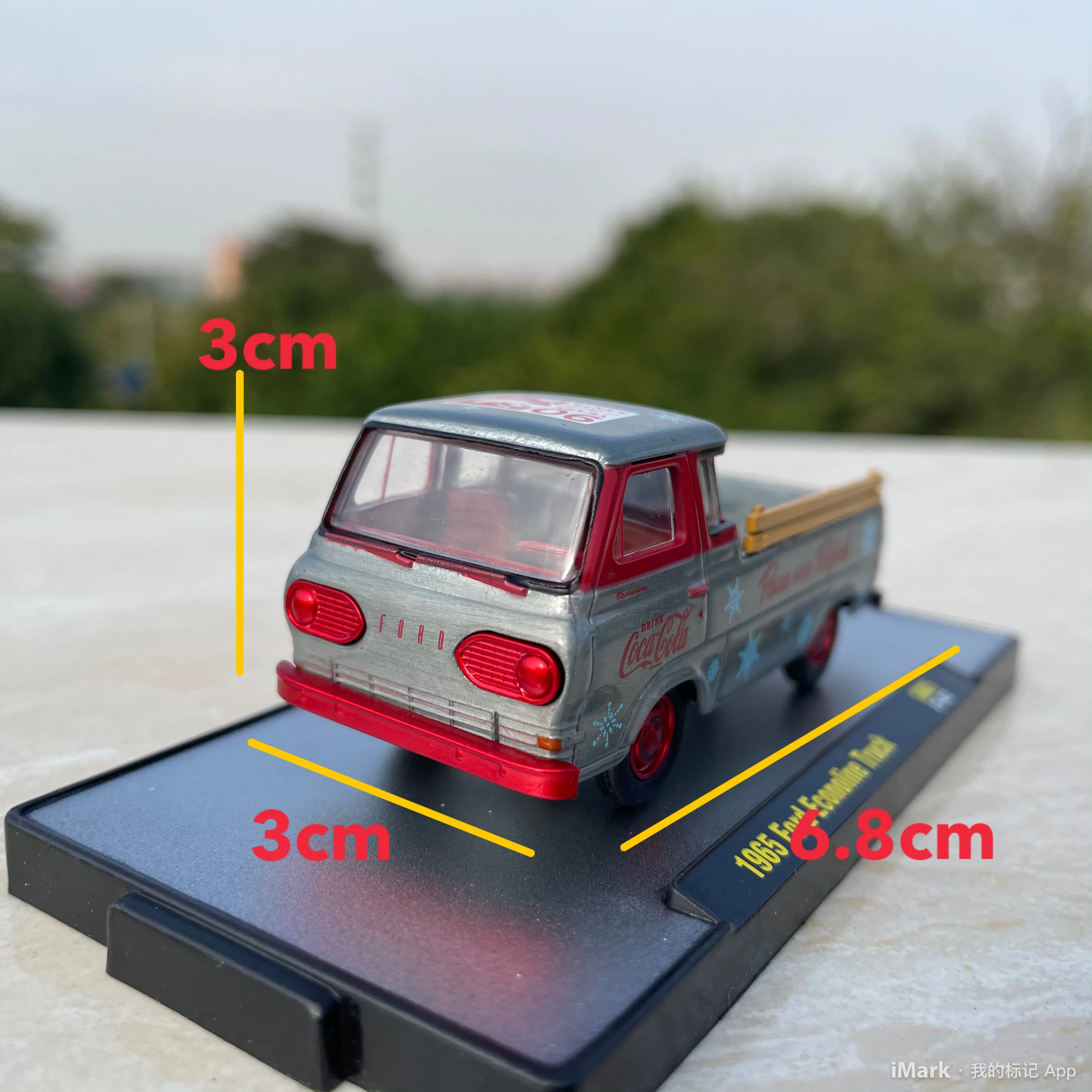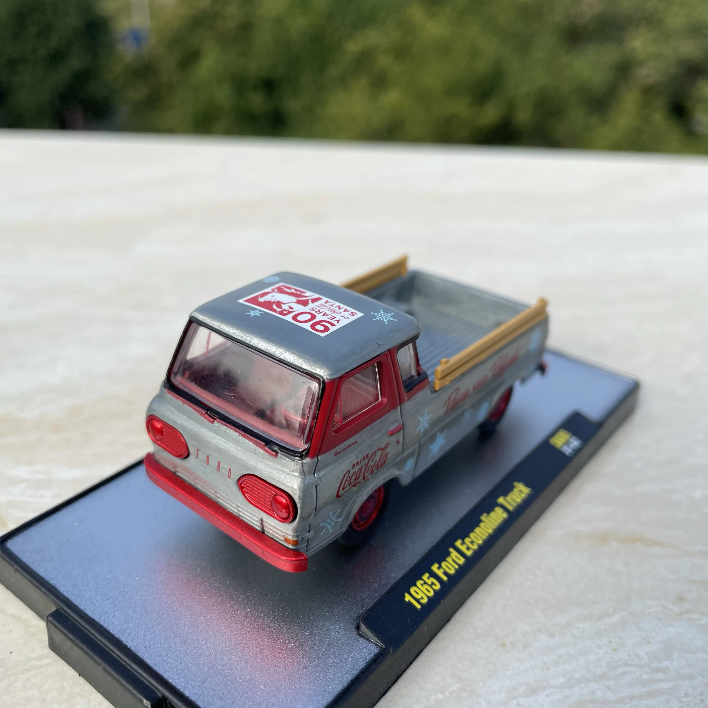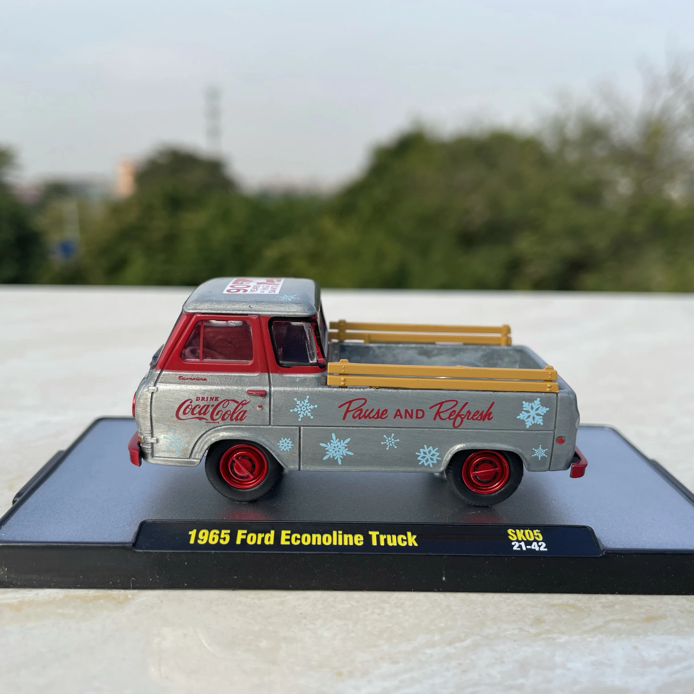 Experience the nostalgic charm of this highly detailed 1:64 scale diecast model of the iconic 1965 Ford Econoline Pickup Truck. Perfect for collectors or enthusiasts, this replica captures the vintage aesthetic with a sleek metallic silver body accented with bold red elements. The vehicle features a gently curved windshield, rounded cab, and subtle boxy contours reflective of 1960s styling. Clear plastic windows reveal a simplified yet detailed interior, including visible seating and dashboard elements. The front grille and headlight inserts are delicately painted red, complemented by a contrasting red bumper. The cargo bed showcases classic branding, with red “Coca-Cola” logos, a “Pause and Refresh” slogan, and blue snowflake decorations, evoking a retro, vintage vibe. Vibrant yellow side rails add lively color accents, making this model a standout piece.