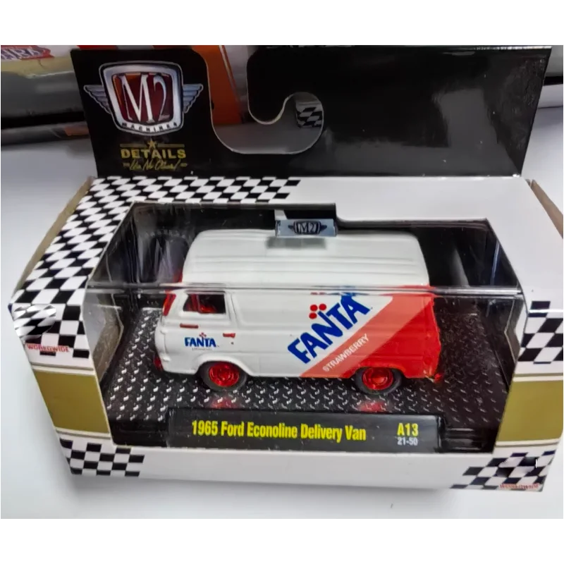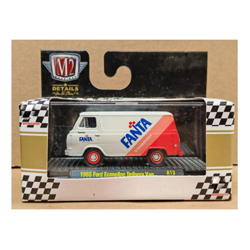 Experience the charm of mid-60s American design with this meticulously crafted diecast model of the 1965 Ford Econoline Delivery Van. Standing approximately 7 centimeters long, it features a sleek, rounded body shape characteristic of the era. The alloy construction provides a durable, shiny metallic finish that beautifully captures the vintage aesthetic. The primary white body contrasts vividly with bold red accents on the front bumper, headlights surrounds, and rear side panel, creating an eye-catching visual appeal. The prominent blue “FANTA” logo set against a vibrant red splash graphic adds a lively touch, complementing the overall retro theme. With detailed sculpted front features, such as rectangular headlights, a grille, and a streamlined hood, this model offers a nostalgic yet polished look ideal for collectors and enthusiasts alike.