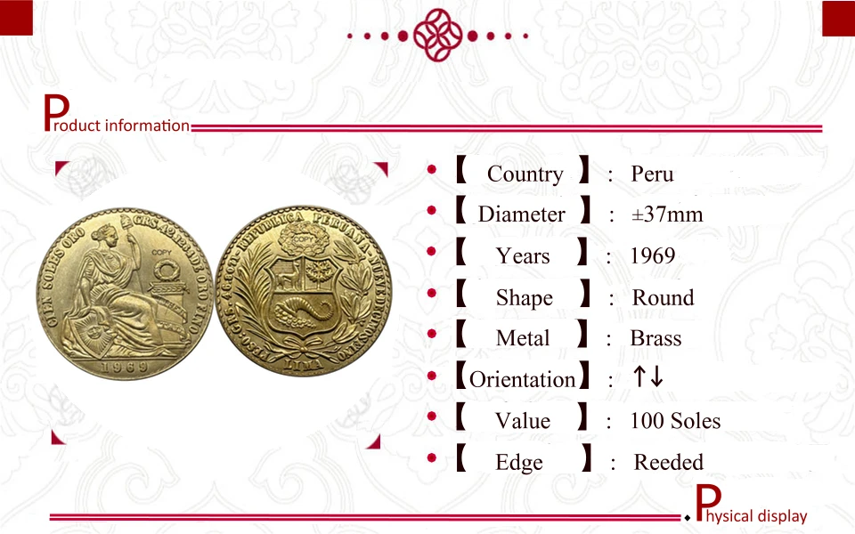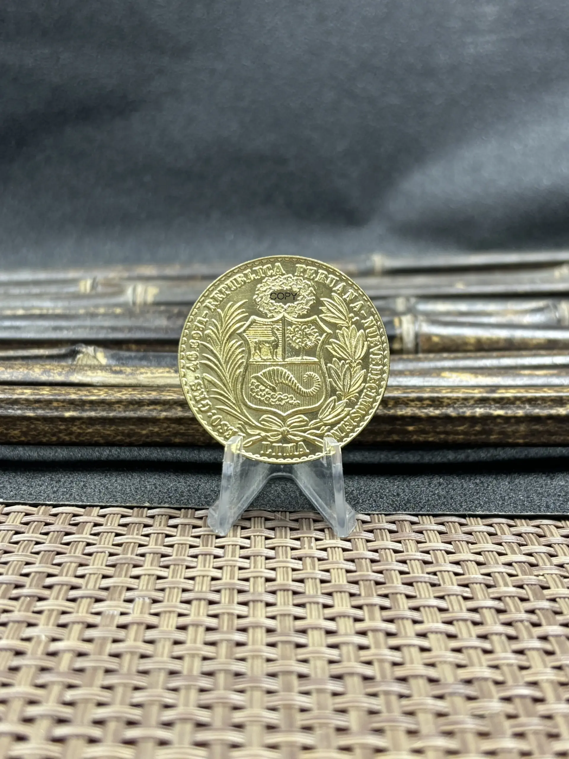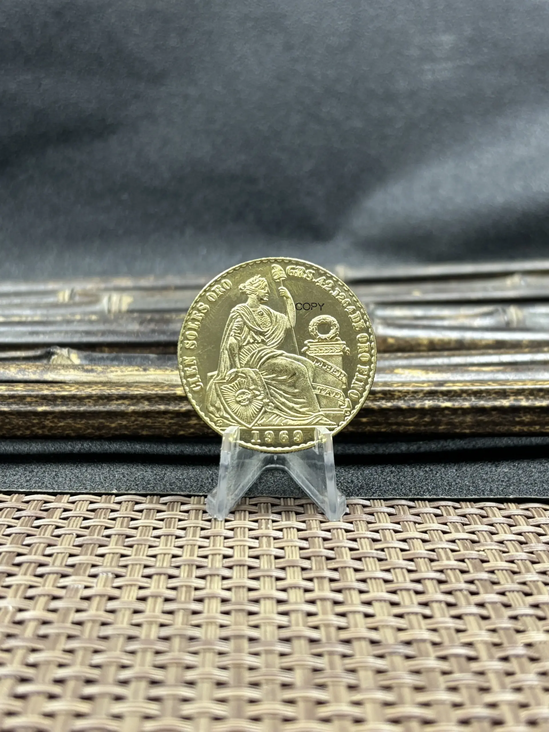 Own a stunning replica of the 1969 Lima 100 Soles Oro Libertad coin, measuring approximately 40mm in diameter and 2.5mm in thickness. Crafted from high-quality metal with an aged gold brass finish, it features intricate relief details of a seated female figure holding a torch, resting on a sun-emblazoned shield, topped with a laurel wreath and inscribed “LIBERTAD.” The rim boldly displays “CIEN AÑOS DEL SOLO RES ORO,” celebrating a century of gold coinage. This vintage-style collector’s piece combines craftsmanship with historical symbolism, making it perfect for display or adding a touch of historical elegance to your collection.