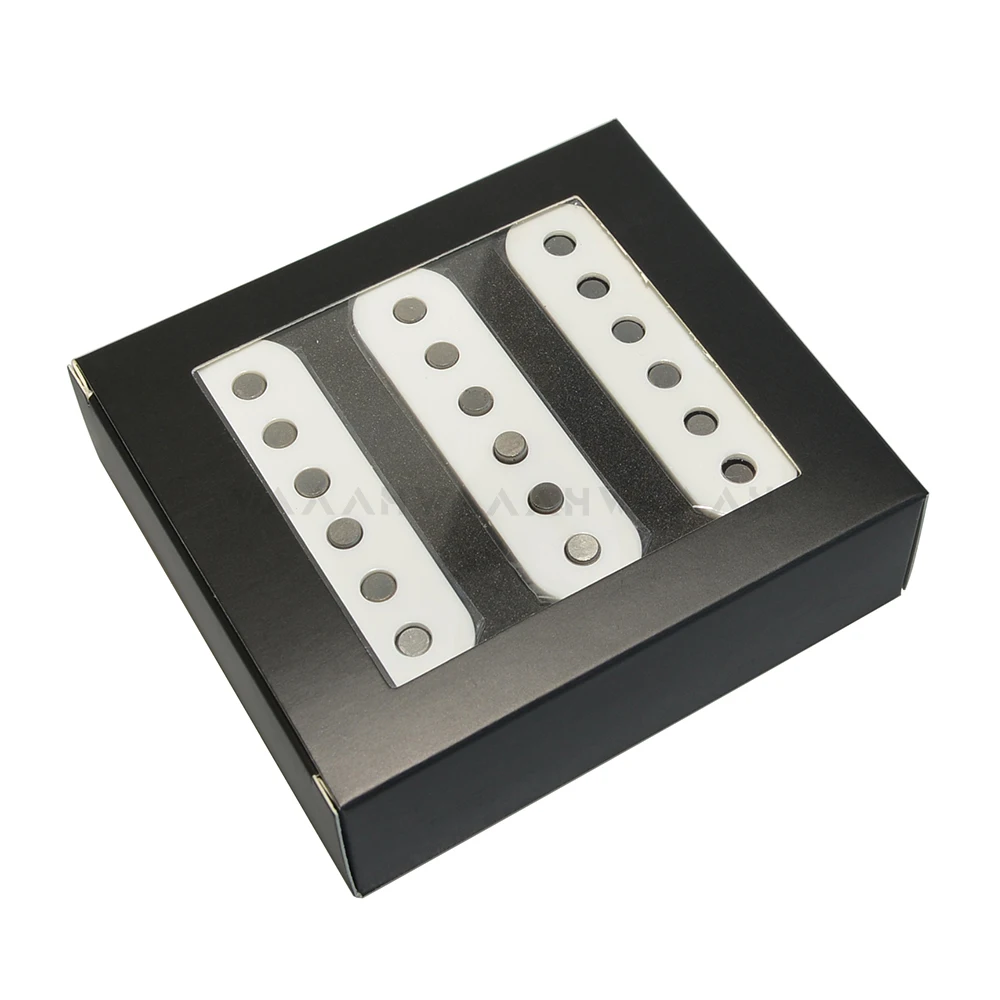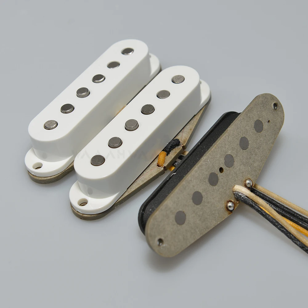 Experience authentic vintage tone with this set of three 52mm spacing single-coil guitar pickups featuring enamel-coated Alnico 5 magnets for focused, dynamic sound. Designed for left-hand guitars, these pickups deliver warm, transparent, and punchy late-’60s blues-rock tones, with staggered pole pieces ensuring balanced output across strings. Crafted with vintage cloth wiring, gray fiber bobbins, and high-quality coil wire in AWG, they evoke a classic aesthetic while providing reliable performance. Included are six mounting screws and tubings for easy installation, making these pickups perfect for semi-hollow or solid-body guitars seeking that iconic vintage sound.