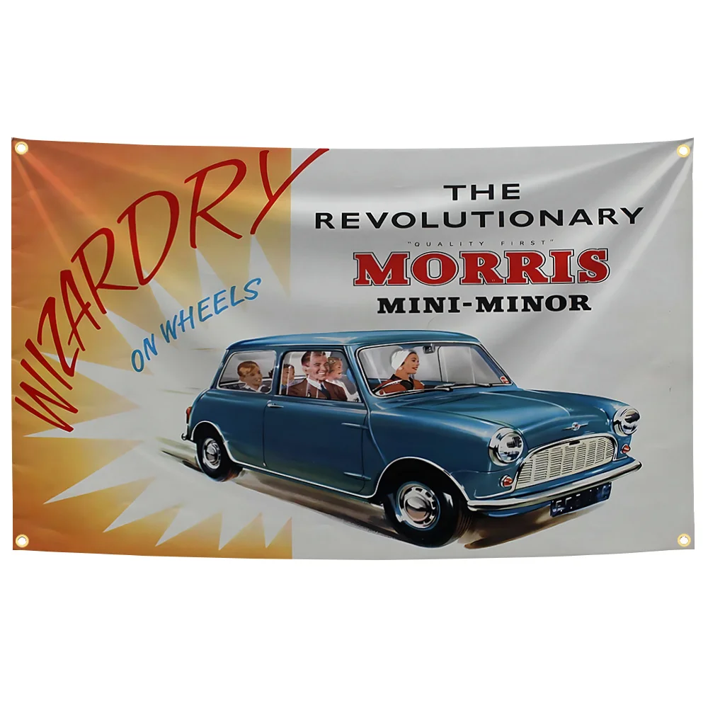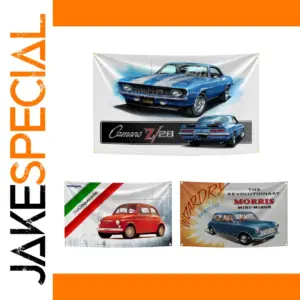 - Compatible for indoor and outdoor use, with a dimension of 90x150cm, making it ideal for garage decoration, events, or automotive shows, emphasizing vintage automotive culture.