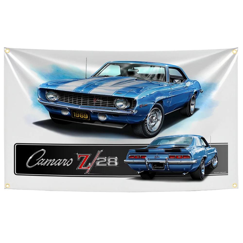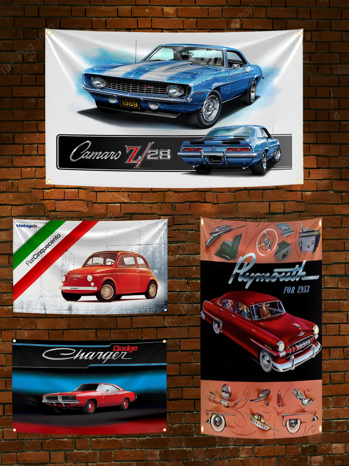 - Design features a striking blue 1969 Plymouth Barracuda Z/28 with realistic front and side views, complemented by smaller banners of a cheerful red Fiat 500 and a lively blue Mini, evoking nostalgic automotive charm.