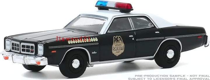 Experience the nostalgic charm of this intricately detailed 1:64 scale diecast model of the 1977 Dodge Monaco police car. Crafted with precision, this collectible features a sleek black body highlighted by sharp white accents on the roof and sides, perfectly capturing the classic police vehicle style. The model boasts authentic details such as side mirrors, door handles, and a distinctive grille, all made from durable metal to ensure longevity. The wheels are black with shiny chrome hubcaps, and textured tires add realism and depth to the design. Whether displayed on your shelf or in a collection, this detailed miniature evokes a vintage era filled with character and history. Its scenic sunset-lit backdrop enhances its nostalgic appeal, making it an ideal addition for enthusiasts and collectors alike.