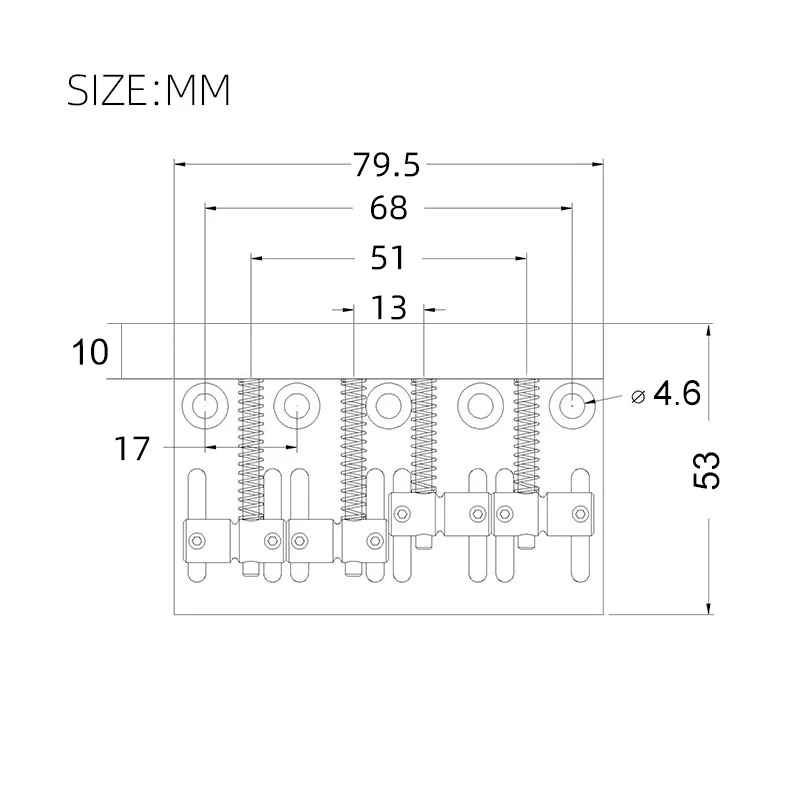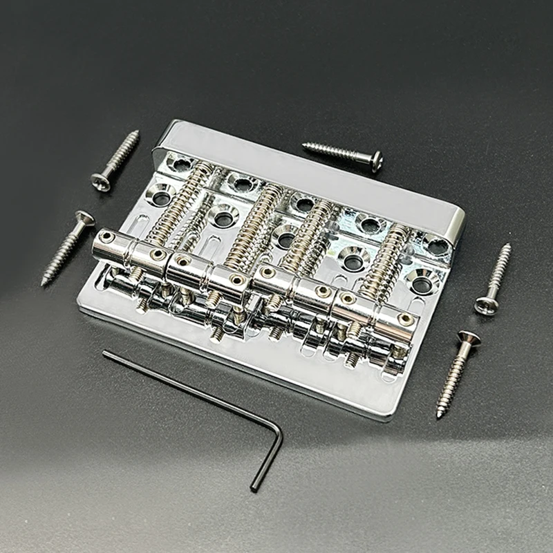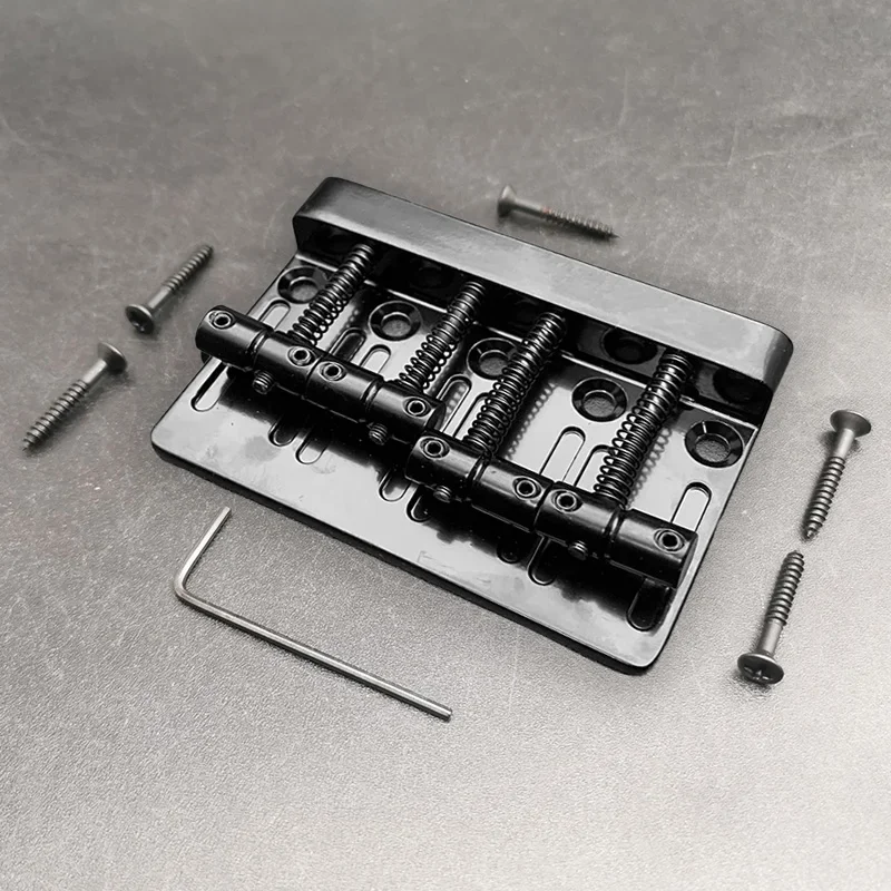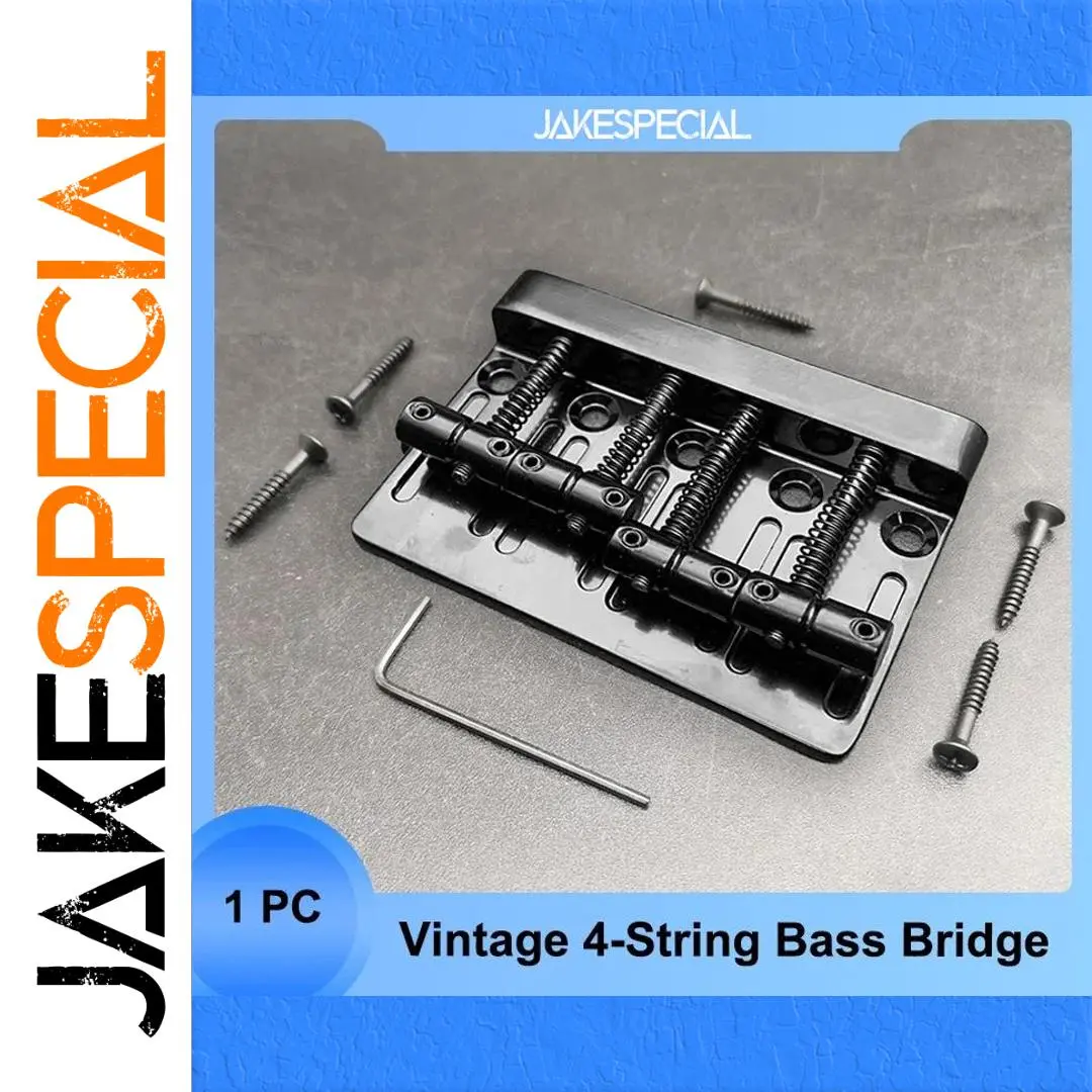 The Vintage 4-String Bass Bridge is expertly crafted from durable zinc alloy, featuring a stylish black finish that enhances its vintage charm. It measures 79.5mm in length and 53mm in width, designed for seamless fixed top-loading installation. With a string spacing of 19mm, it includes four saddles equipped with a coil spring mechanism for precise height adjustments and secure string placement. The package comes with 5 mounting screws and a handy wrench, making installation effortless. Elevate your electric bass guitar with this blend of modern functionality and classic aesthetics for a rewarding playing experience.