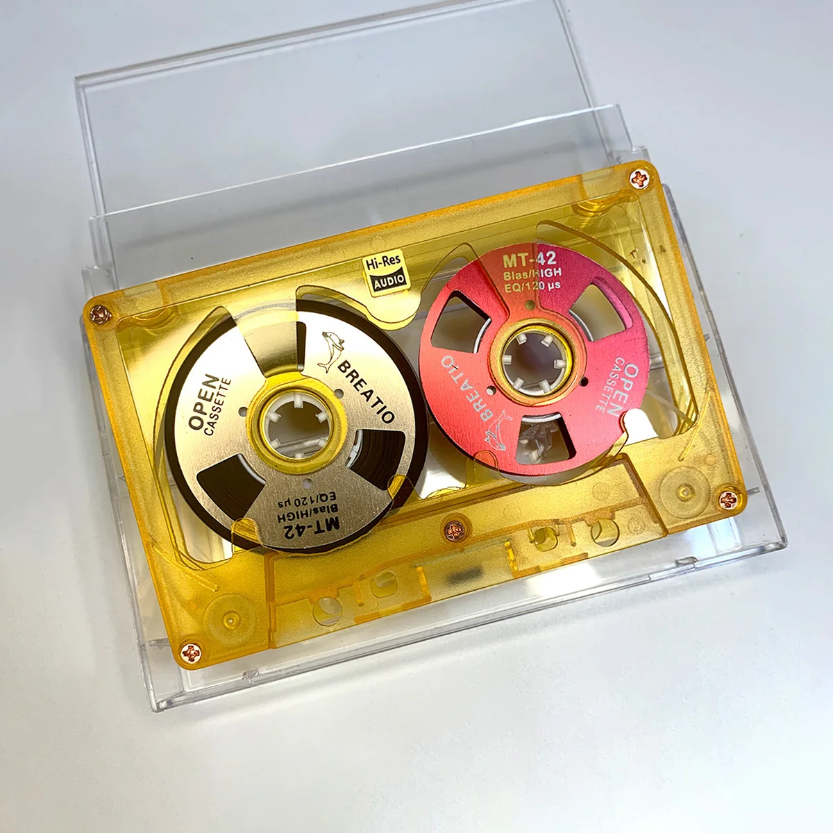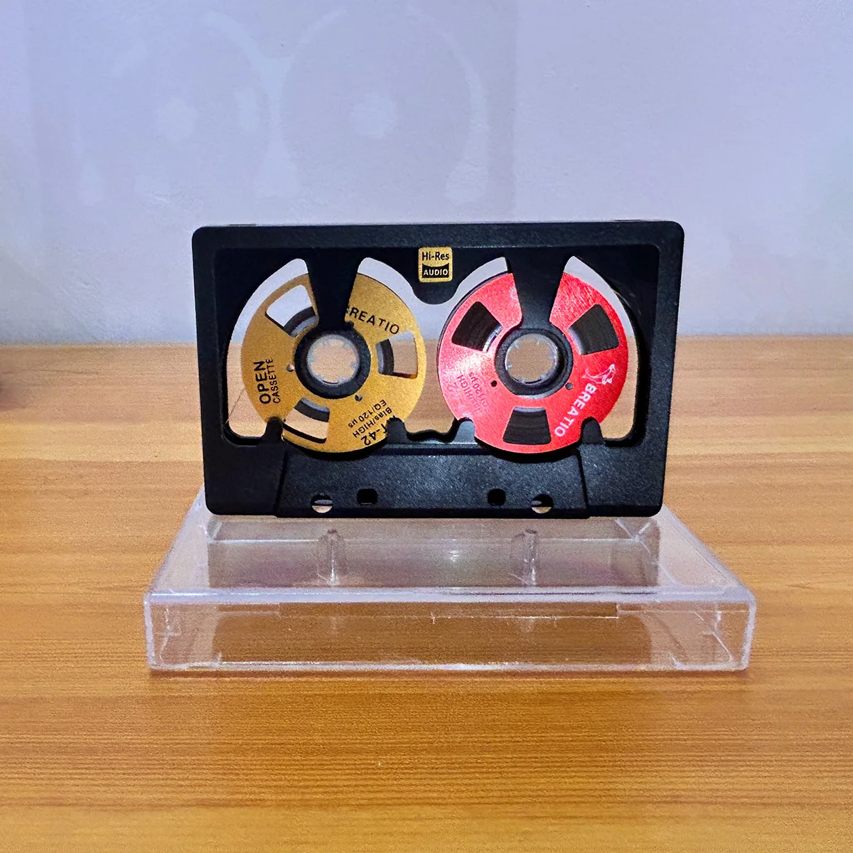 Step back into nostalgic sound with this vintage-style audio cassette tape. Featuring a sleek black plastic shell with rounded edges, this cassette showcases a retro design paired with vibrant, colorful labels on its metal reels. The open window reveals two shiny reels marked with bold red and yellowish labels, adding visual interest. Its durable construction includes visible screws at each corner, and a subtle “Hi-Res AUDIO” gold sticker emphasizes its high-fidelity potential. Designed for self-recording and compatible with various professional and consumer audio equipment, this cassette provides 50 minutes of total recording time (25 minutes per side). Perfect for collectors and enthusiasts who appreciate vintage sound aesthetics with modern reliability.