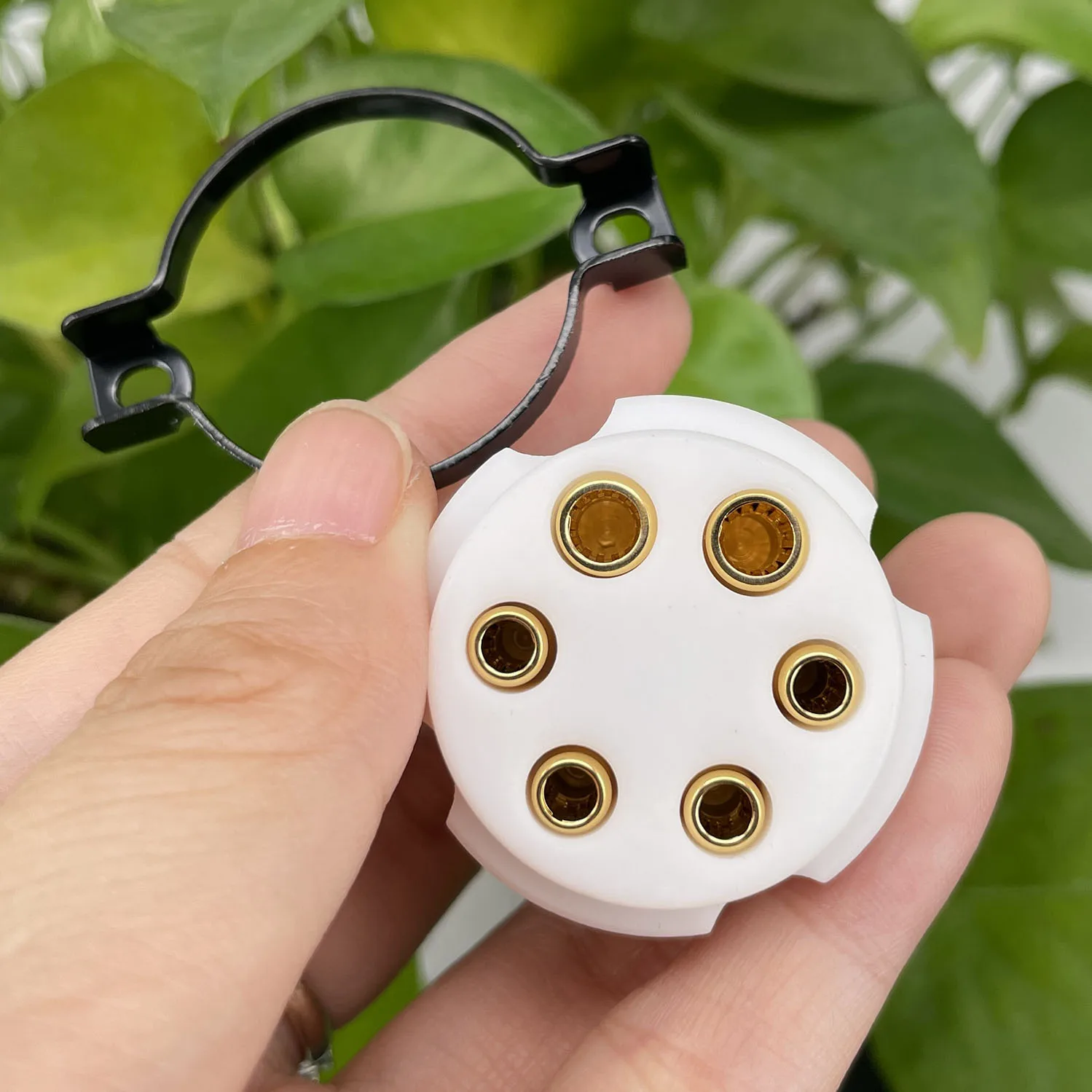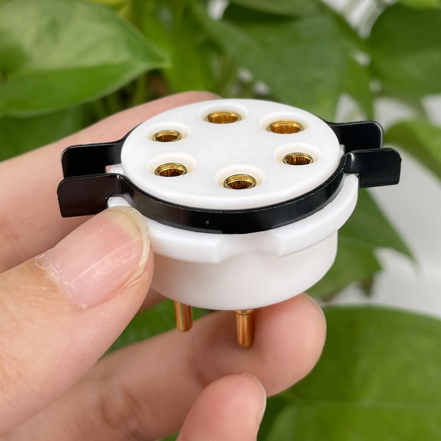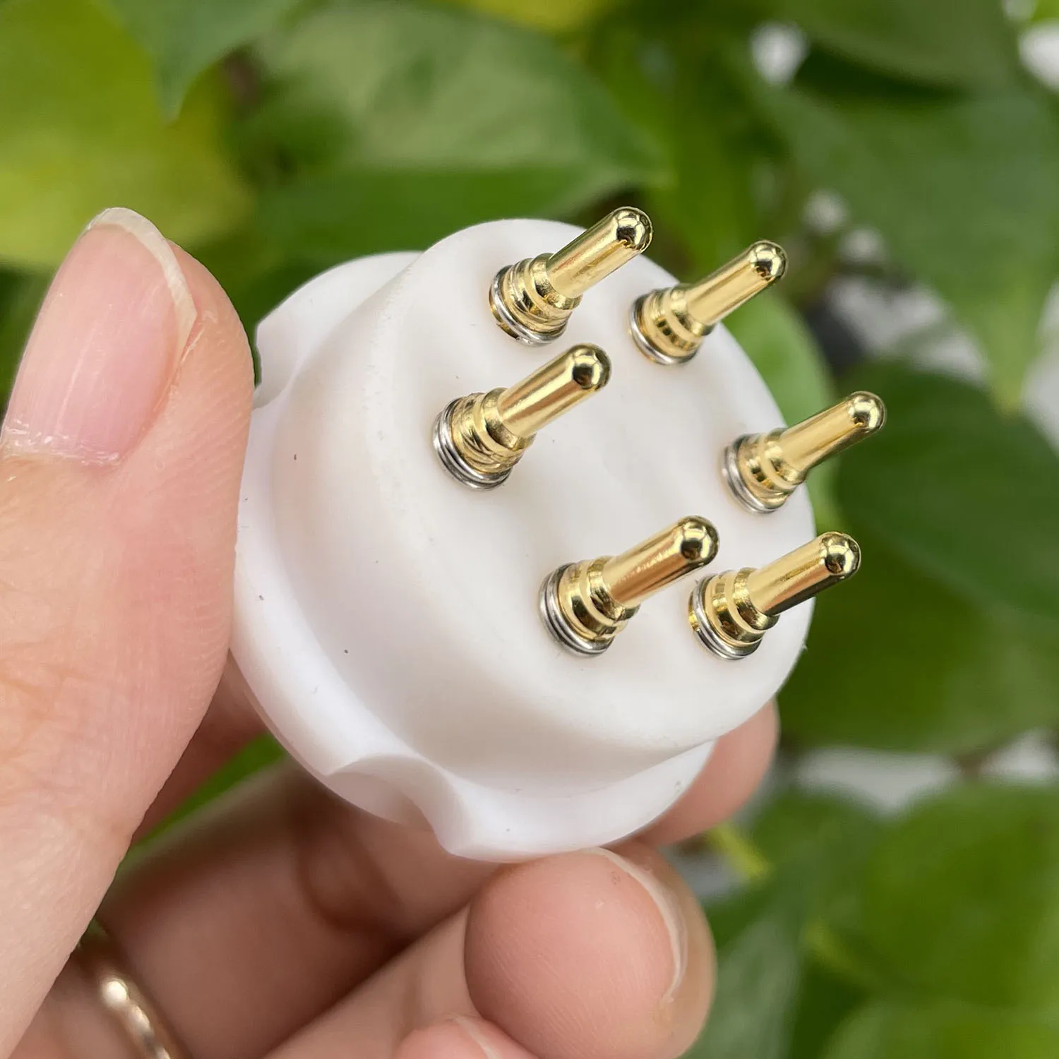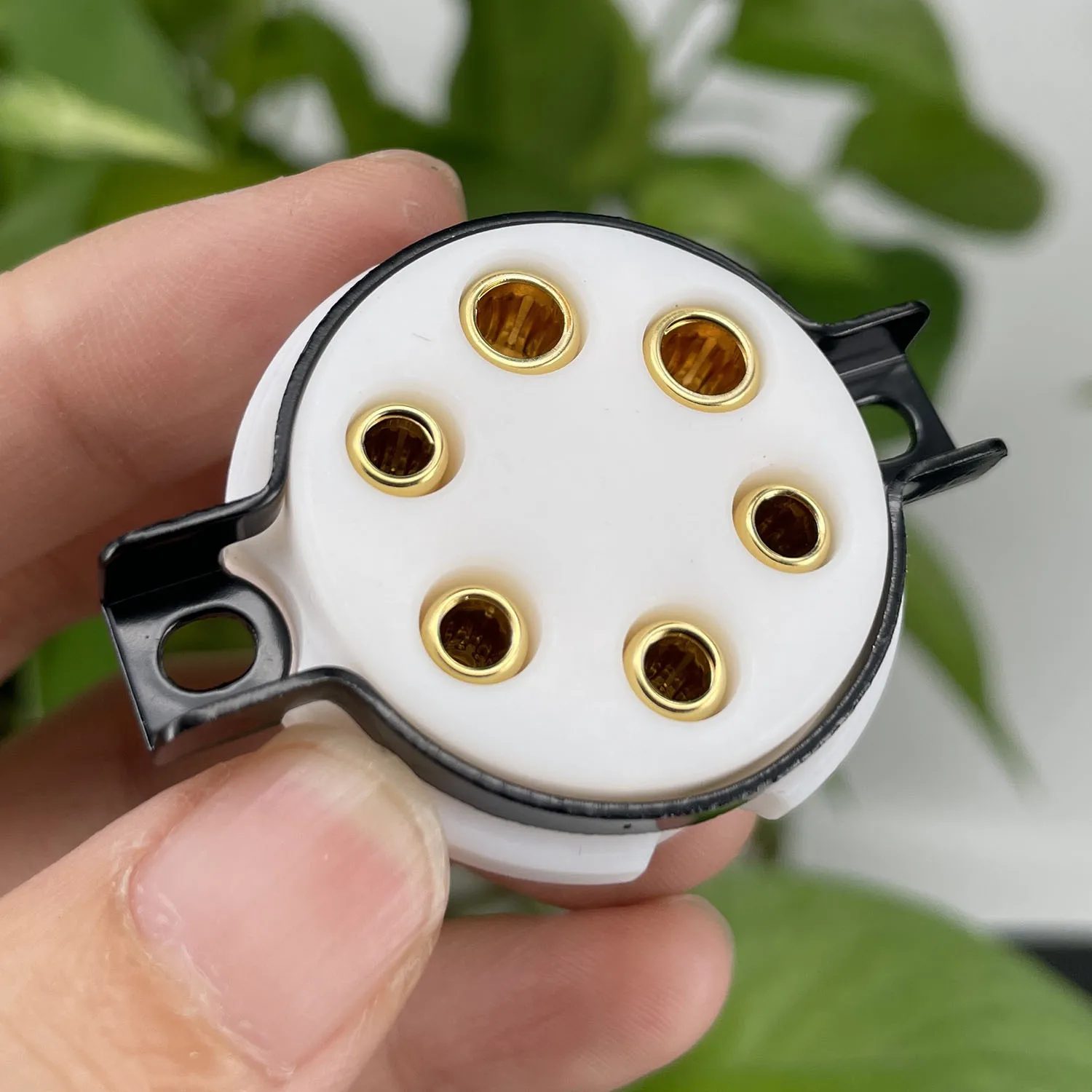Elevate your vintage audio projects with this premium PTFE 6-pin tube socket, featuring gold-plated brass pins for optimal conductivity and corrosion resistance. Measuring 30mm in panel cut-out diameter with screw holes spaced 38mm center-to-center, it accommodates models such as WE310A, 2A5, 6C6, 6D6, VT57, VT58, 41, 42, 57, 77, 78, 1265, RK43, RK49, and T21. With a total height of 27.50mm including pins, its durable black anodized steel fix ring provides sturdy mounting. Crafted from insulating ceramic material, this new socket combines vintage charm with reliable craftsmanship, perfect for high-fidelity tube amplifiers and audio enthusiasts.