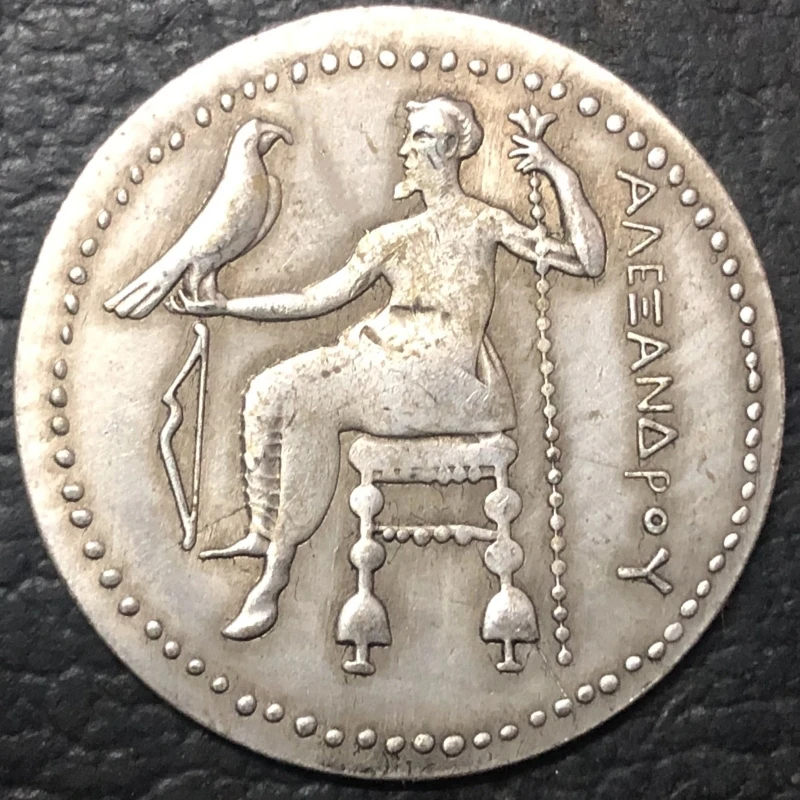 This antique-style metal casted tetradrachm features a detailed relief of Alexander III the Great, depicting him seated on an ornate throne with a bearded face, short curly hair, and facing right. The design includes a soaring eagle resting on his arm and an upright scepter with a floral or sunburst top, all surrounded by a dotted border. Crafted to resemble an ancient Greek coin, it has a textured, aged surface that enhances its vintage appeal. Dating from 1840 or earlier, this European-inspired replica captures patriotic themes and classical artistry, making it a striking collectible for enthusiasts. Please note, it is a copy, not an original ancient coin.