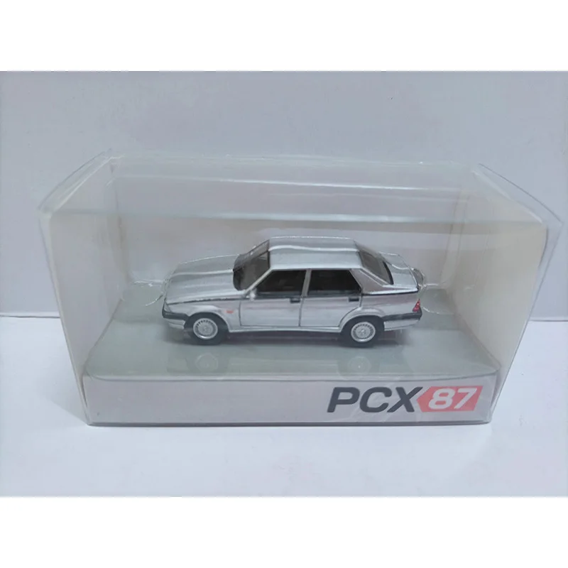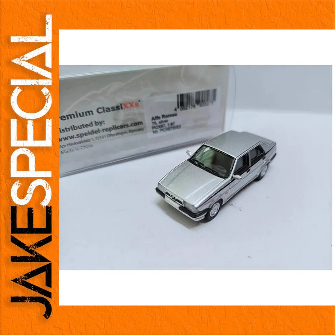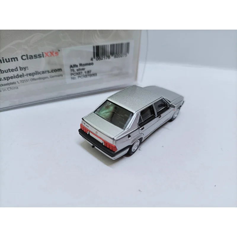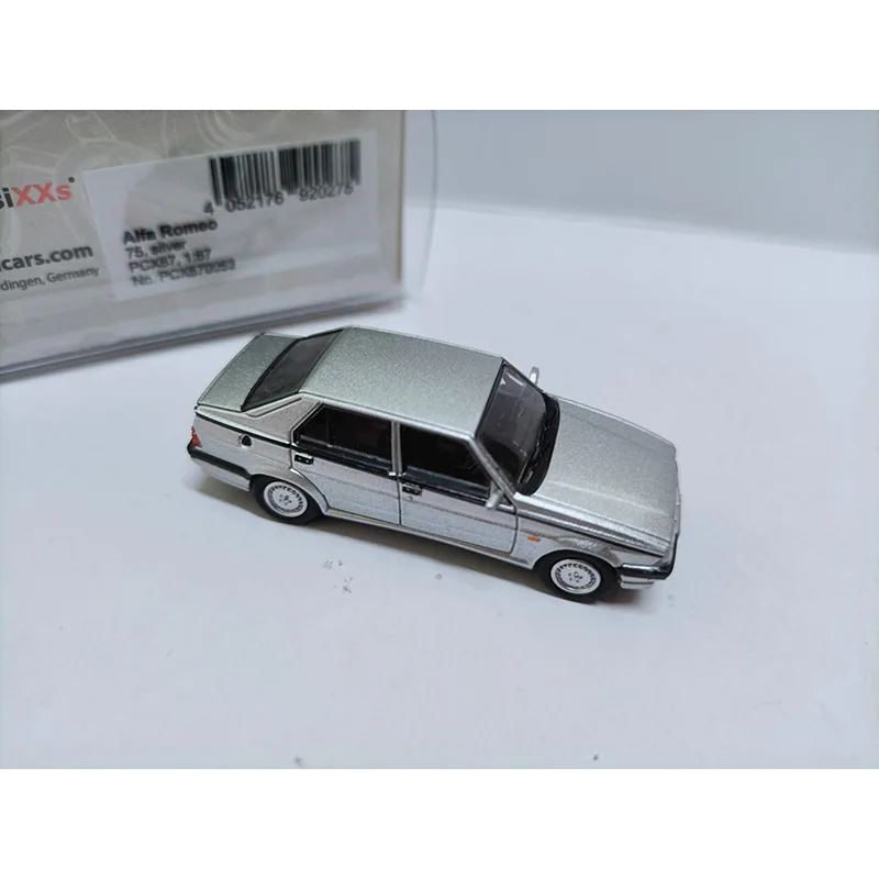 Imagine adding a touch of vintage elegance to your collection with this detailed Alfa Romeo 75 miniature. Crafted at a 1:87 scale, it captures the sleek, classic design of the original vehicle with precision. The model features a stunning silver metallic finish that reflects light beautifully, complemented by transparent windows framed with black trim for added realism. Its boxy shape and angular contours evoke a nostalgic charm, while small details like the grille, headlights, door indentations, and side mirrors showcase expert craftsmanship. The silver hubcap-style wheels with modest tread tires enhance the model’s authenticity. Whether on display or in a collection, this model is a refined addition that stands out for its craftsmanship and detailed aesthetics.