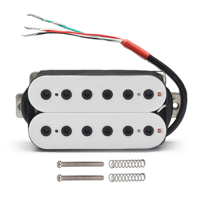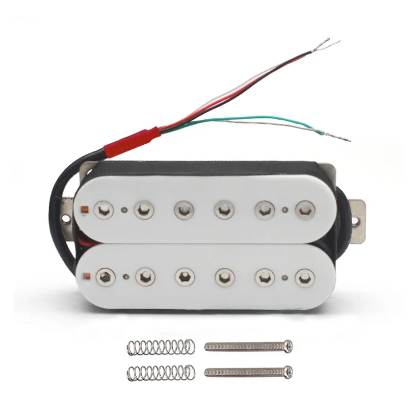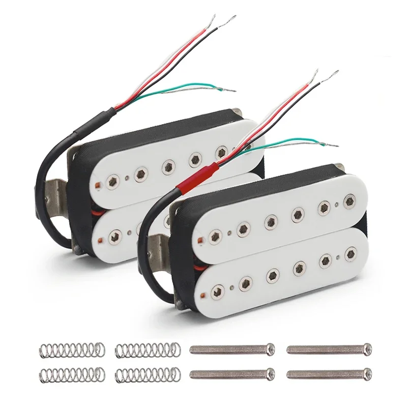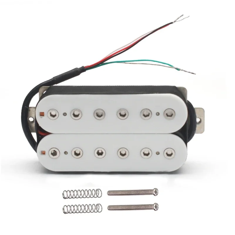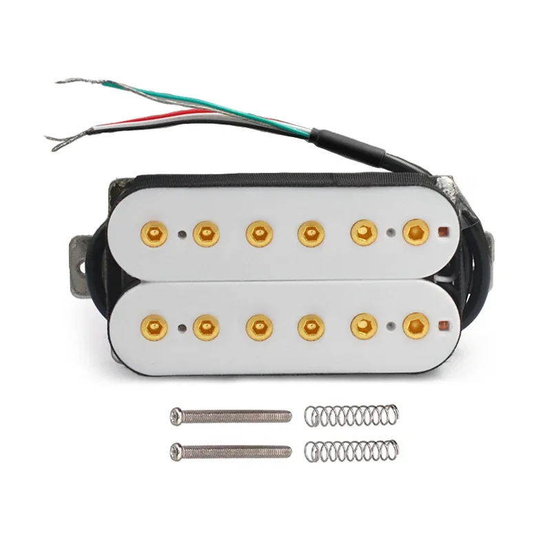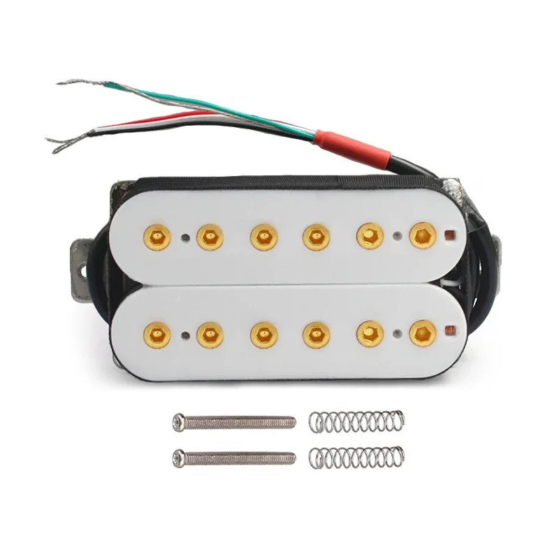 The Vintage Alnico 5 Humbucker Pickup is designed for electric guitars, featuring a robust double coil construction with a neck resistance of 7.5k and a bridge resistance of 15k. It utilizes Alnico 5 magnets and adjustable hexagonal screw pole pieces with 50mm pole spacing for the neck and 52mm for the bridge. Fully wax potted and sealed, it delivers a clean, warm, and smooth sound with high output. The pickup includes PVC wiring with 4 output options and can be switched to single-coil mode. Dimensions are 69mm x 36mm, and each set includes 2 screws and 2 springs. Available in white, black, gold, and chrome options.
