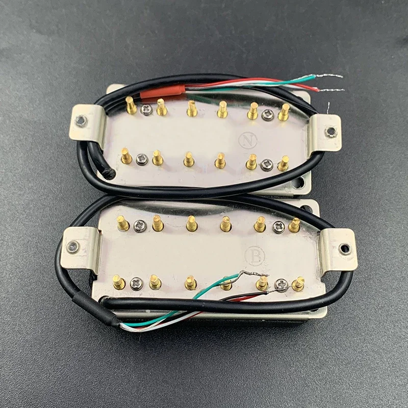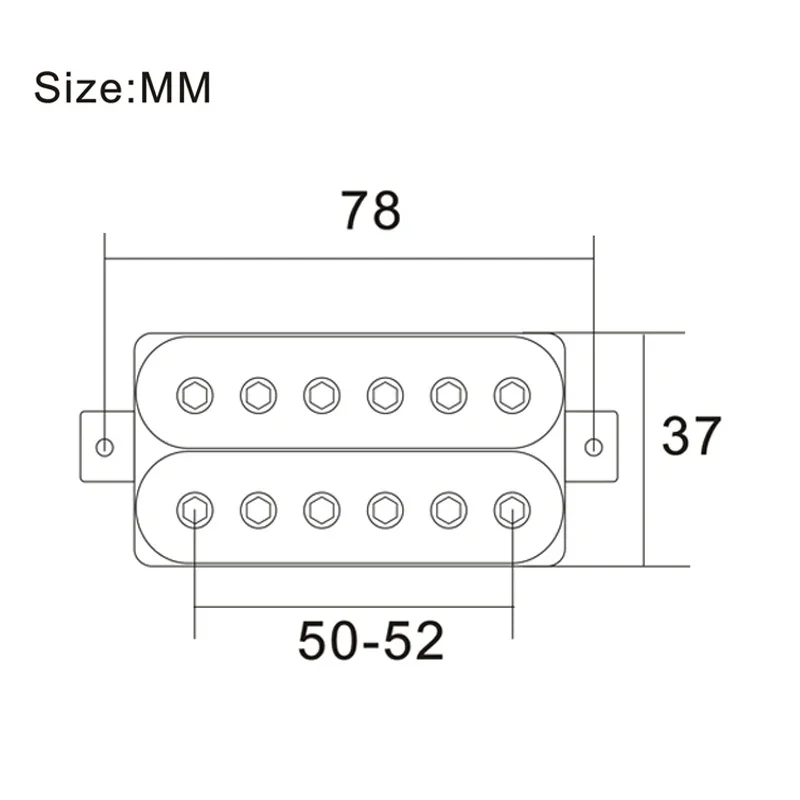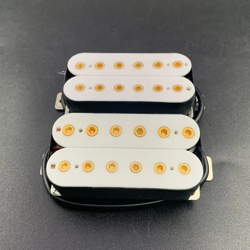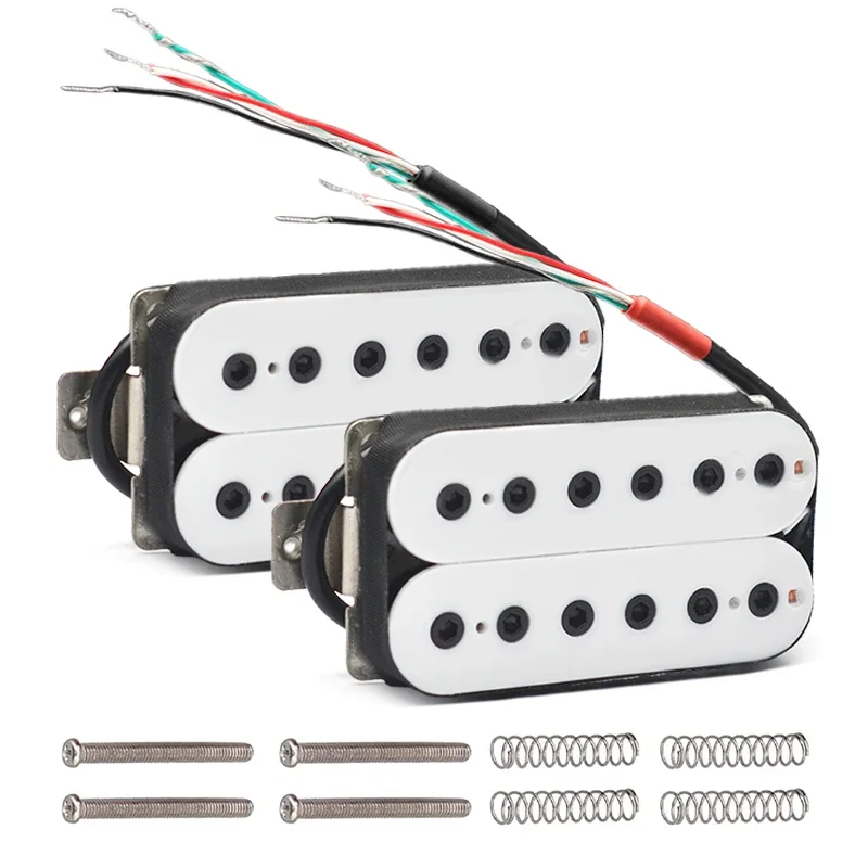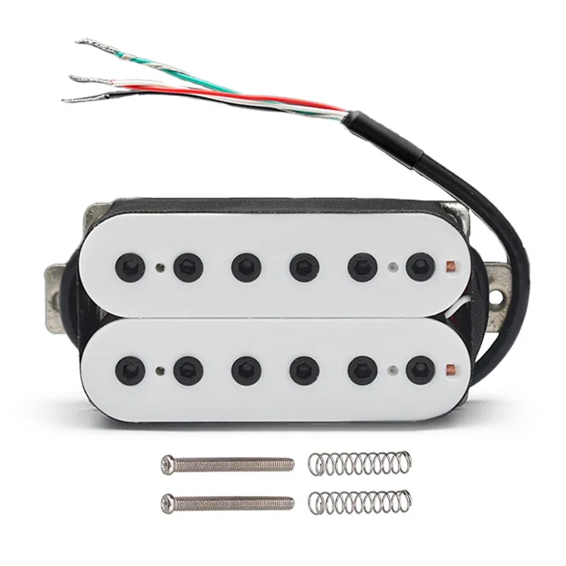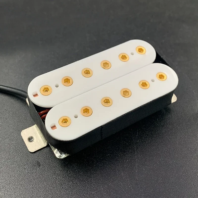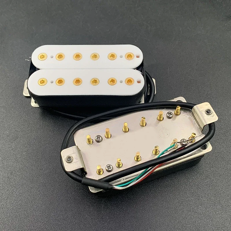 The Vintage Alnico 5 Humbucker Pickup is designed for electric guitars, featuring a robust double coil construction with a neck resistance of 7.5k and a bridge resistance of 15k. It utilizes Alnico 5 magnets and adjustable hexagonal screw pole pieces with 50mm pole spacing for the neck and 52mm for the bridge. Fully wax potted and sealed, it delivers a clean, warm, and smooth sound with high output. The pickup includes PVC wiring with 4 output options and can be switched to single-coil mode. Dimensions are 69mm x 36mm, and each set includes 2 screws and 2 springs. Available in white, black, gold, and chrome options.