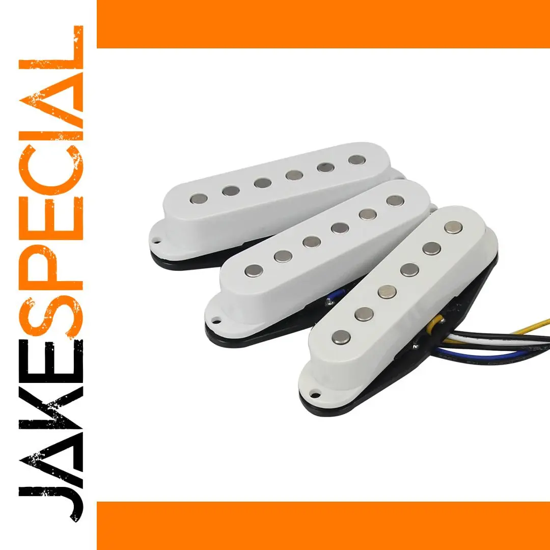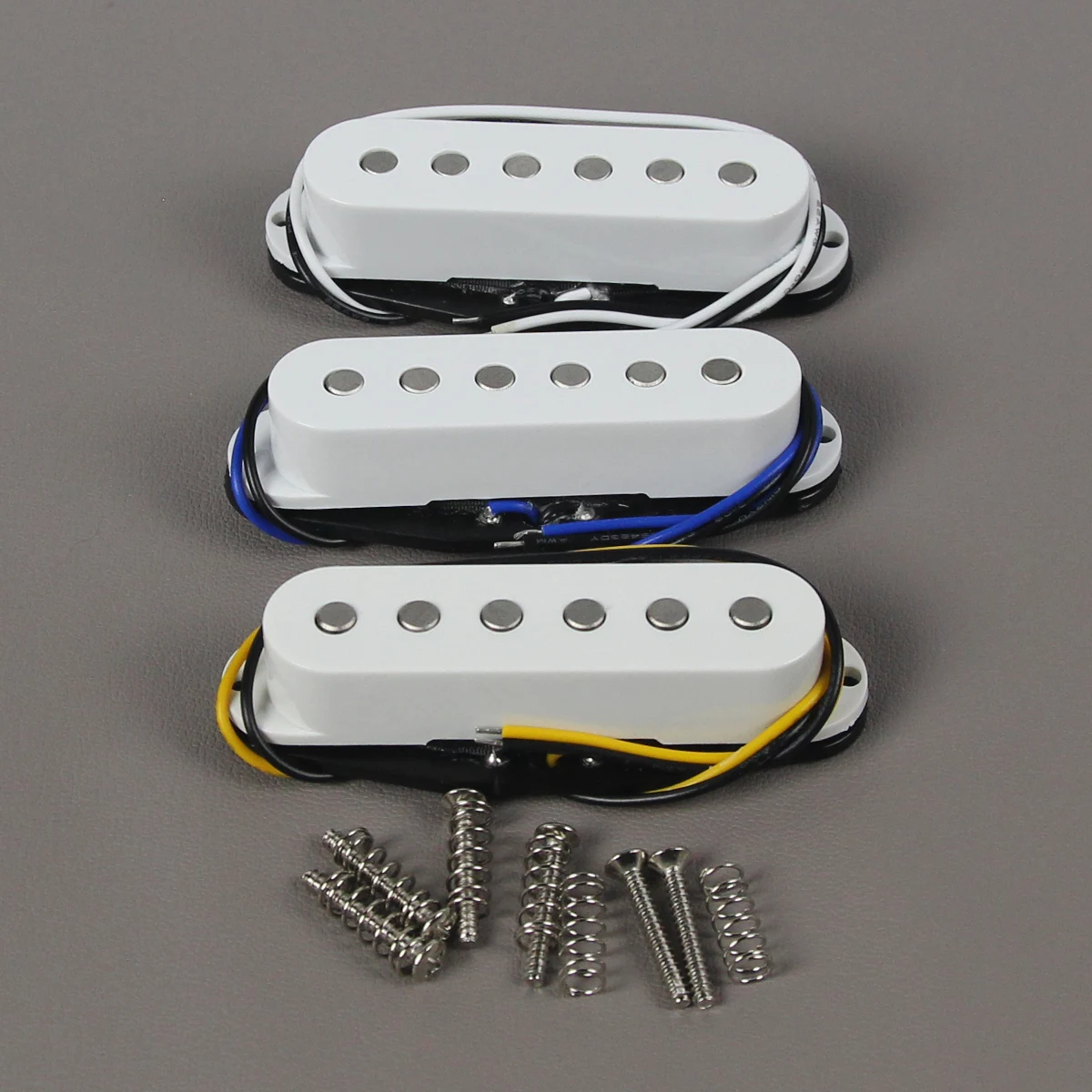- Set includes three passive single coil pickups, designed for SSS configuration, each with a white glossy finish and flat pole pieces for a clean look and precise sound control.