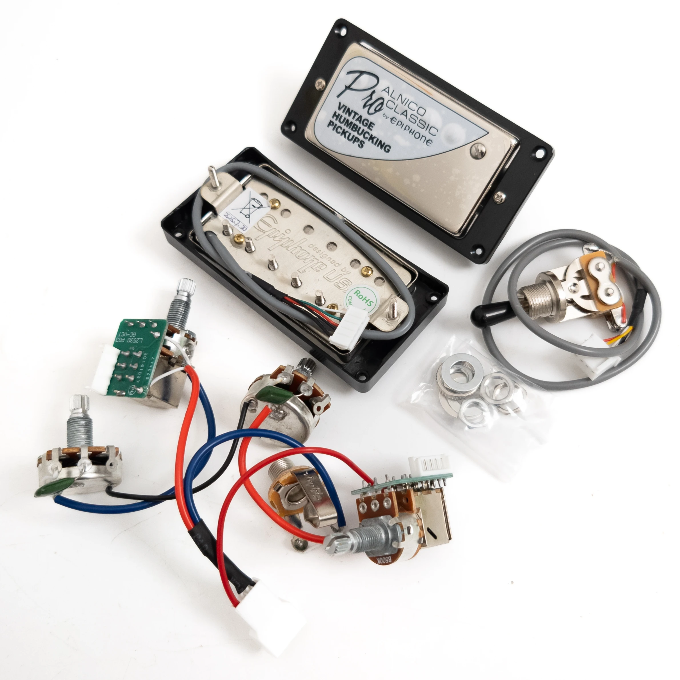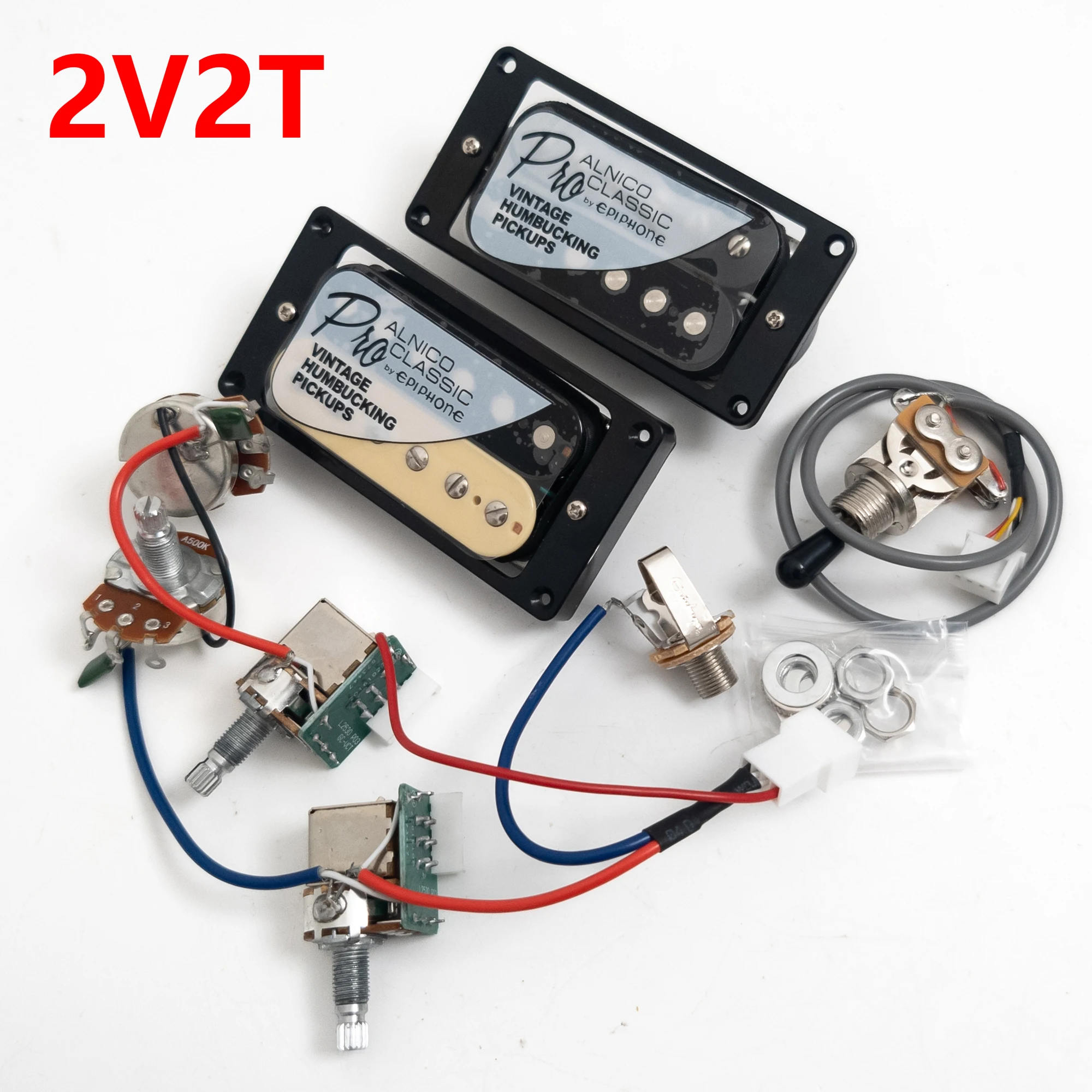 - Includes two matched Alnico V humbuckers: 7.5KΩ neck, 15KΩ bridge, wax-potted for feedback control. The vintage aesthetic complements LP guitars with a sleek black finish and reflective labels.