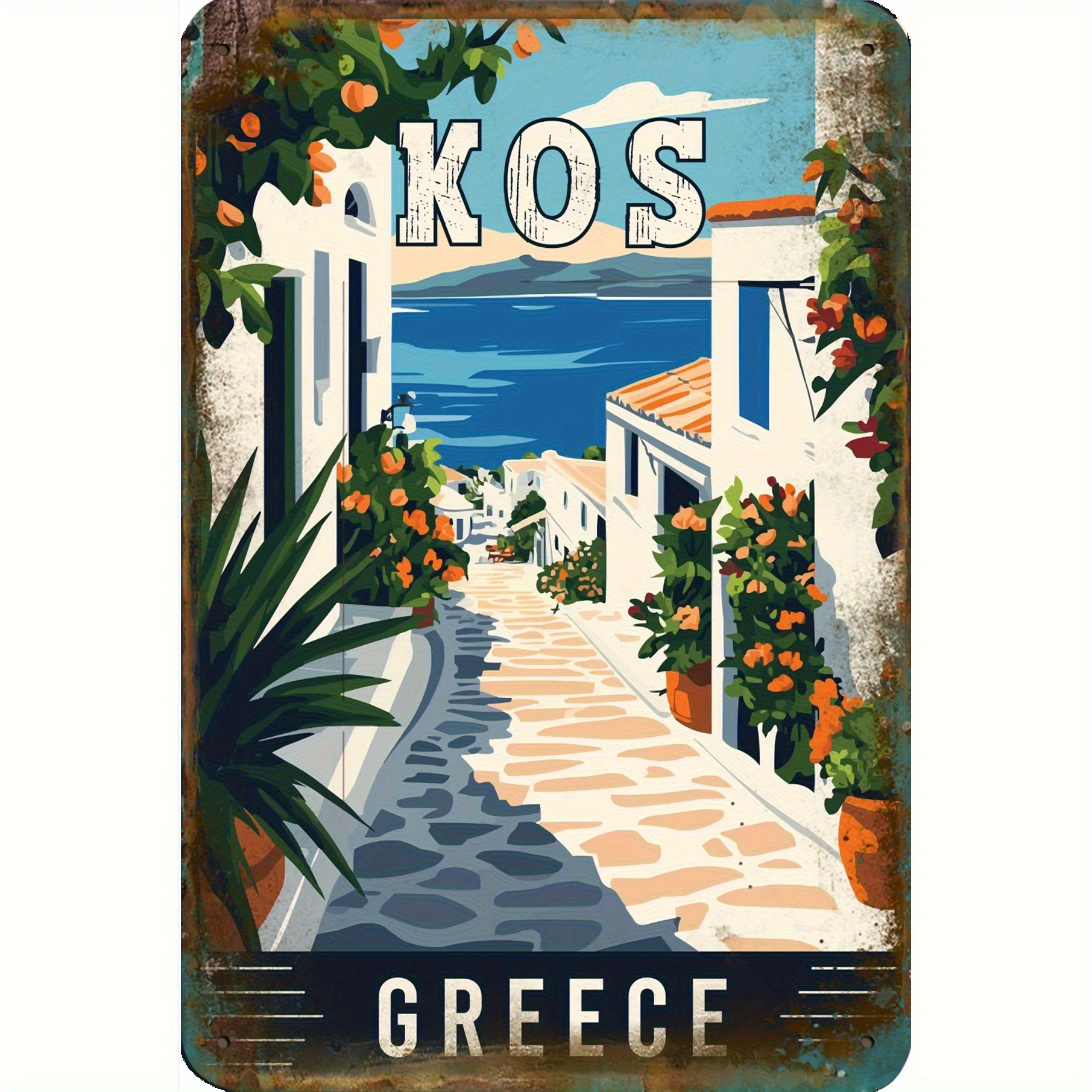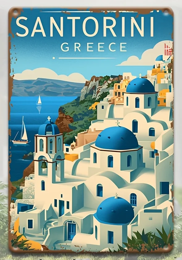 Transform your space with this this vintage aluminum wall sign, measuring 20cm x 30cm (8×12″). Its rustic, weathered finish brings nostalgic charm, perfect for enhancing indoor or outdoor environments like gardens, cafes, or offices. Crafted from high-quality aluminum, it is lightweight at approximately 120 grams and features a vibrant, colorful illustration of a white-domed building set against a bright blue sky with scattered clouds. Its classic rounded corners and pre-drilled holes make installation simple and secure. The sign’s waterproof and weather-resistant design ensures durability in all weather conditions, making it an ideal decorative accent that conveys a scenic Mediterranean seaside atmosphere. This piece adds character and warmth to any setting.