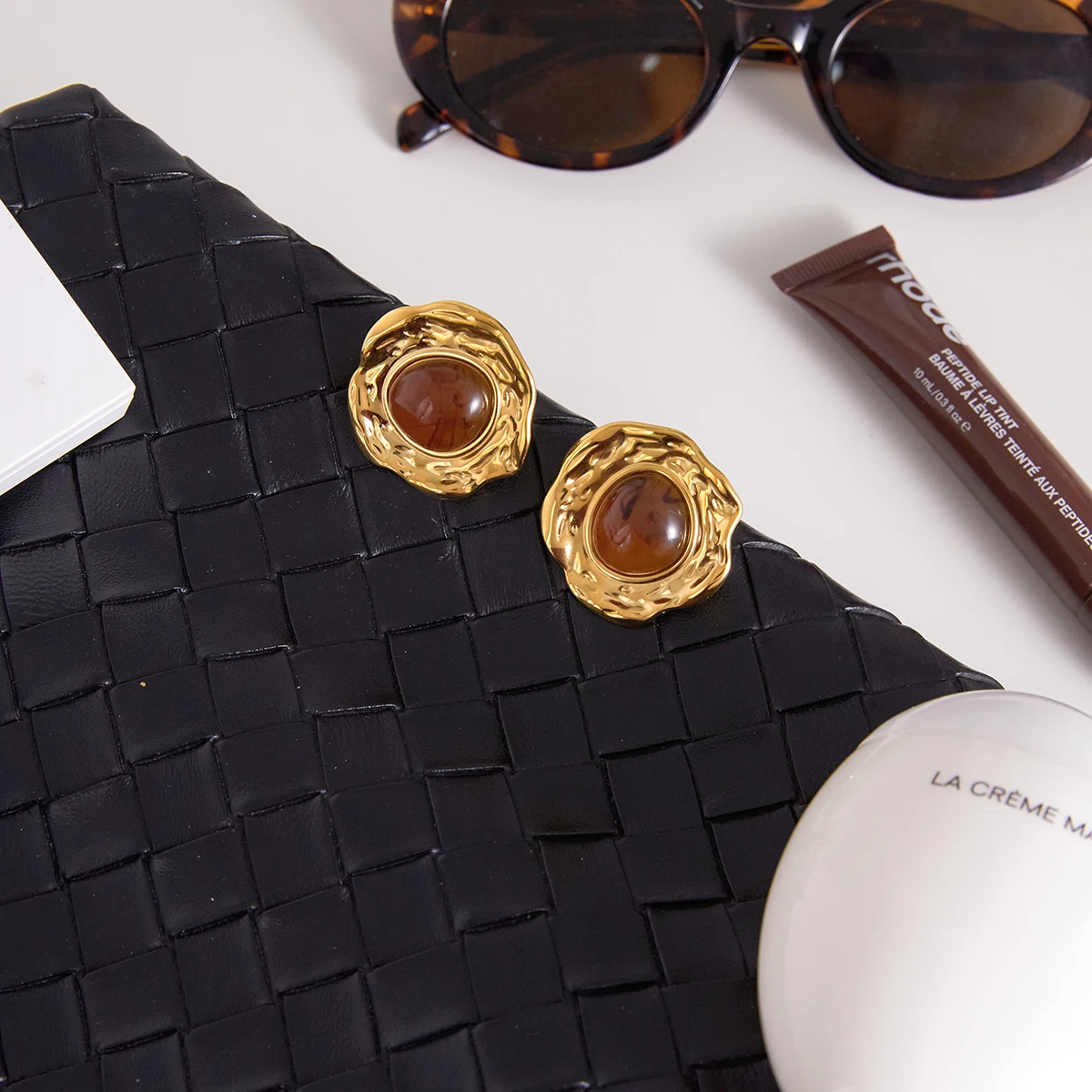 Delight in the vintage charm of these earrings, designed to elevate your style. The large, round amber-colored centerpiece shines brilliantly with a glossy, smooth finish that mimics real amber’s warm radiance. Encased in a textured gold-tone stainless steel setting, the uneven, wavy contours add a handcrafted, artisanal appeal. The bold, eye-catching design combines vibrant amber hues with luxurious platinum accents, perfect for adding a distinctive touch to any outfit. Comfortable screw-back fittings ensure secure wear. Whether you want to add an elegant vintage vibe or elevate your fashion game, these earrings make a statement that’s both sophisticated and unique. They are ideal for those who appreciate artisanal craftsmanship and timeless style.
