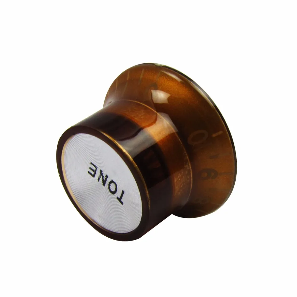 Enhance your electric guitar with this set of four vintage-inspired amber knobs, featuring white numerals. Designed for LP and SG style guitars, these durable, stylish knobs combine functionality with a timeless aesthetic. Made from high-quality plastic with an acrylic top, they offer a glossy finish that highlights their rich amber hue. The conical shape with a rounded top provides an elegant silhouette, while the flat top surface with clear, dark numerals ensures easy readability. Perfect for customizing or upgrading your guitar’s controls, these knobs fit perfectly on 6mm split shafts. Their warm, vintage look will add character and a personalized touch to your instrument, making it stand out on stage or in your collection.