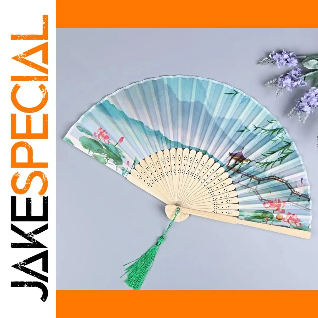 Experience the beauty and artistry of this vintage-style folding fan, crafted from delicate silk and bamboo. Its soft pastel hues and scenic landscape design evoke timeless Asian elegance. Whether used for dance, stage performances, or as a decorative accessory, this fan adds charm and sophistication to any occasion. The finely carved bamboo ribs contribute to its vintage appeal, while the lightweight silk surface showcases a serene scene of mountains, a pagoda, and lotus flowers, creating a harmonious blend of nature and artistry. Its foldable design makes it easy to carry and stylishly functional for a variety of events, from weddings to stylish parties. Elevate your ensemble with a piece that embodies tradition, craftsmanship, and beauty.