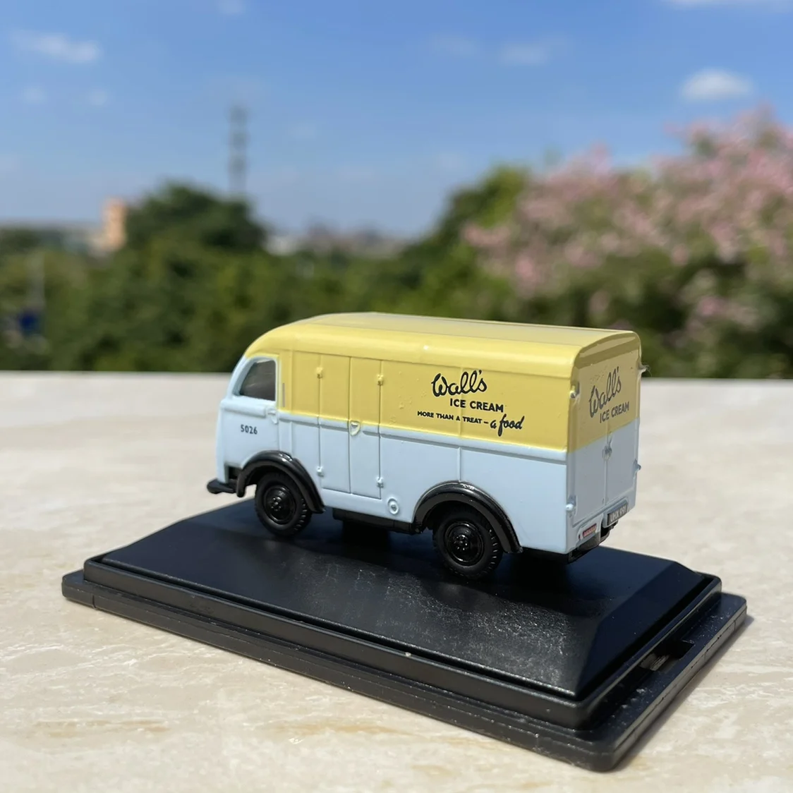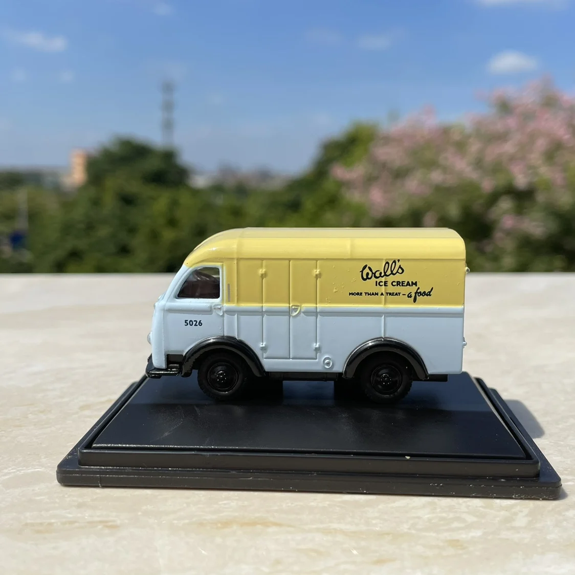 Transport yourself into the nostalgic era with this charming vintage Austin Mini Van diecast model. Crafted with meticulous detail at a 1:76 scale, this collectible captures the essence of mid-20th-century delivery vehicles. Its compact, rounded shape features a delicate two-tone color scheme with a pastel blue body and a vibrant yellow roof, evoking cheerful retro appeal. The front grille with vertical chrome bars, tiny round headlights, and metallic accents enhance realism. The side displays classic black “Wall’s ICE CREAM” text and the prominent number “5026,” adding authentic vintage character. The wheels are simple black with understated hubcaps, and detailed features like door handles, side panels, and a split windshield showcase refined craftsmanship. Perfect for collectors or display enthusiasts.