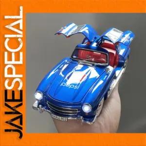 This striking 1:24 scale diecast model of the vintage Mercedes-Benz 300SL is a stunning collectible that beautifully combines classic design with modern playfulness. Finished in vibrant blue with a glossy sheen, the car features intricate detailing, including chrome accents and a realistically crafted front grill. The gullwing doors are open, offering a glimpse into the bright red interior, crafted with meticulous attention to detail. The prominent Pepsi logo adds a whimsical branding touch that enhances its visual appeal, while the functionality of the soft-glow headlights completes this exquisite piece, perfect for collectors aged 14 and over.