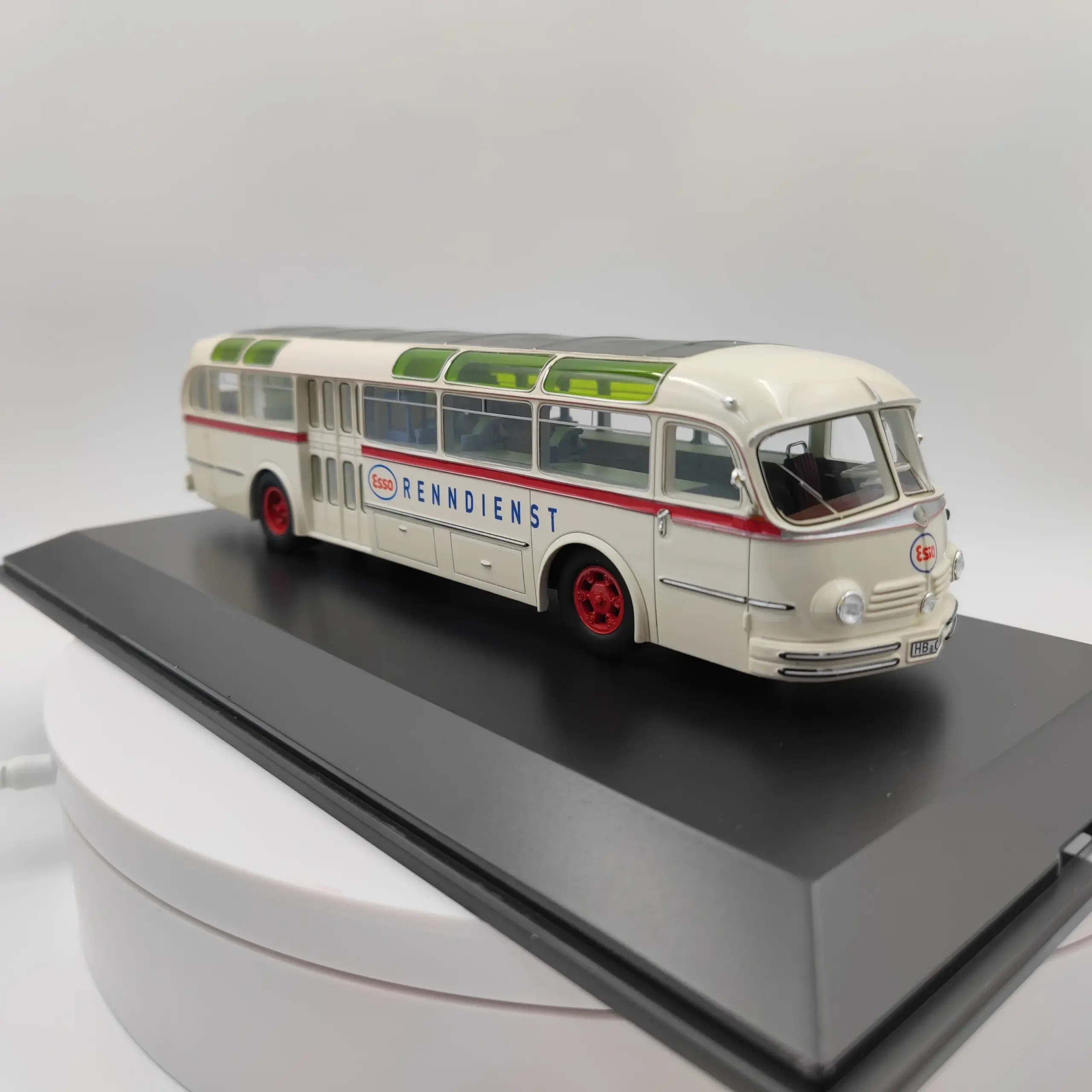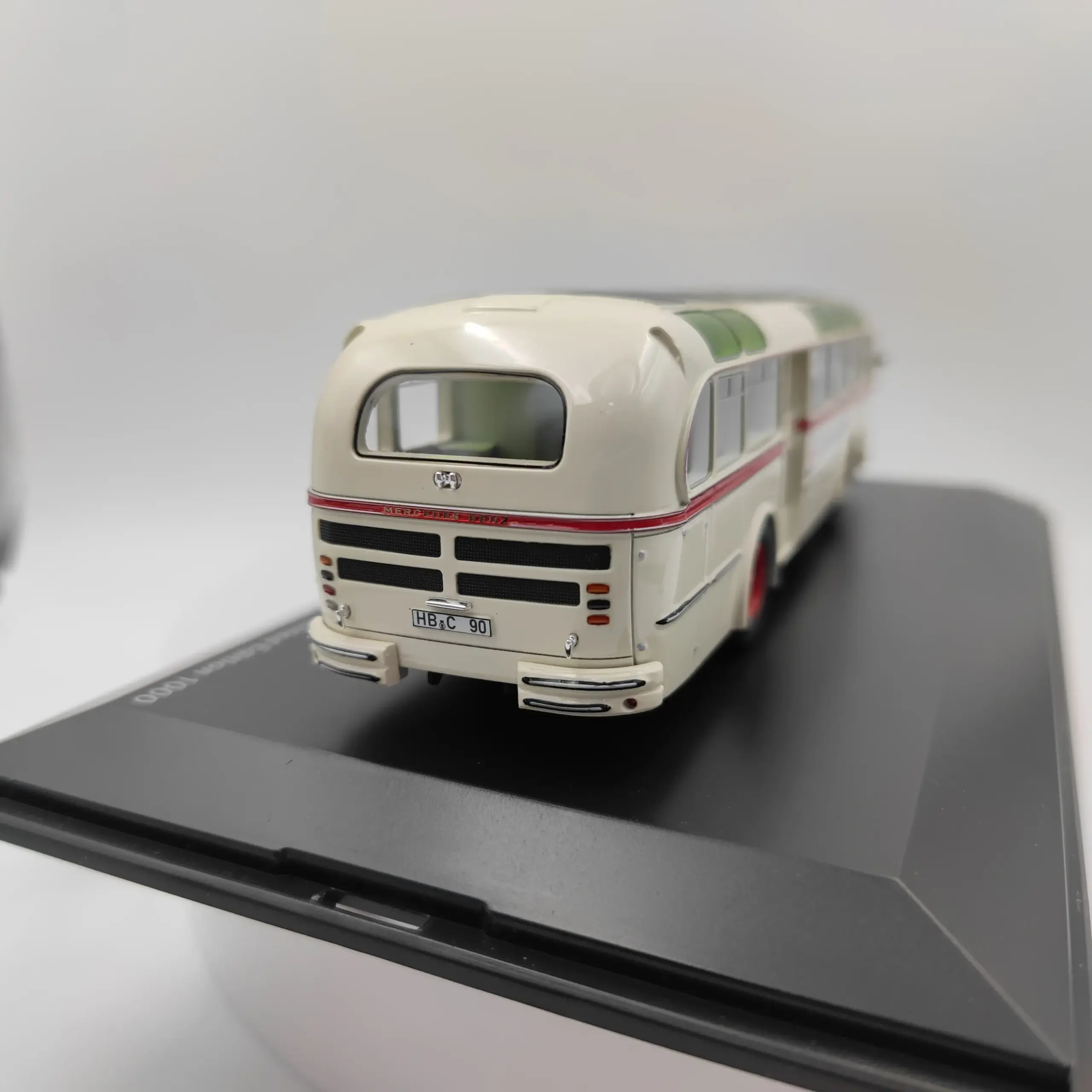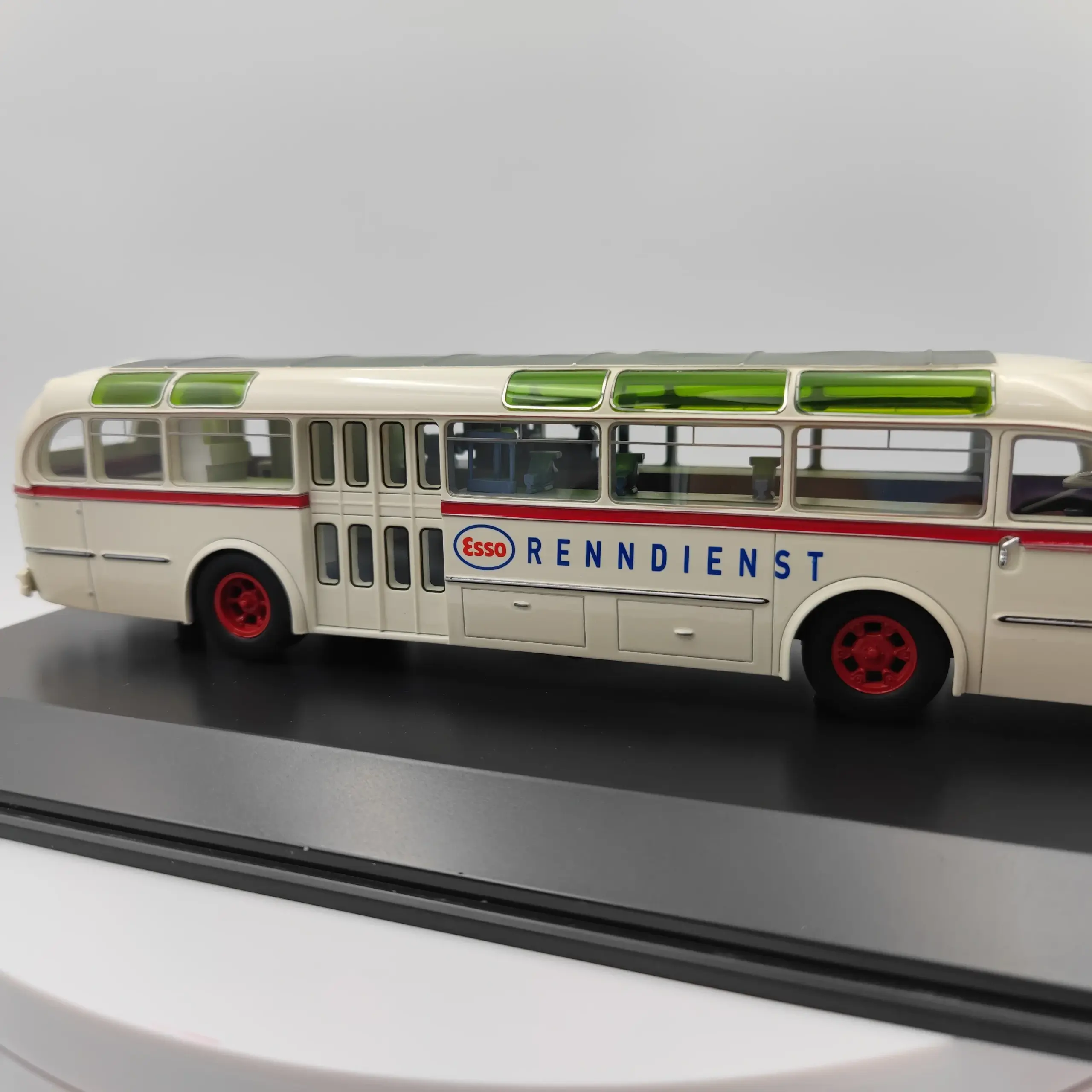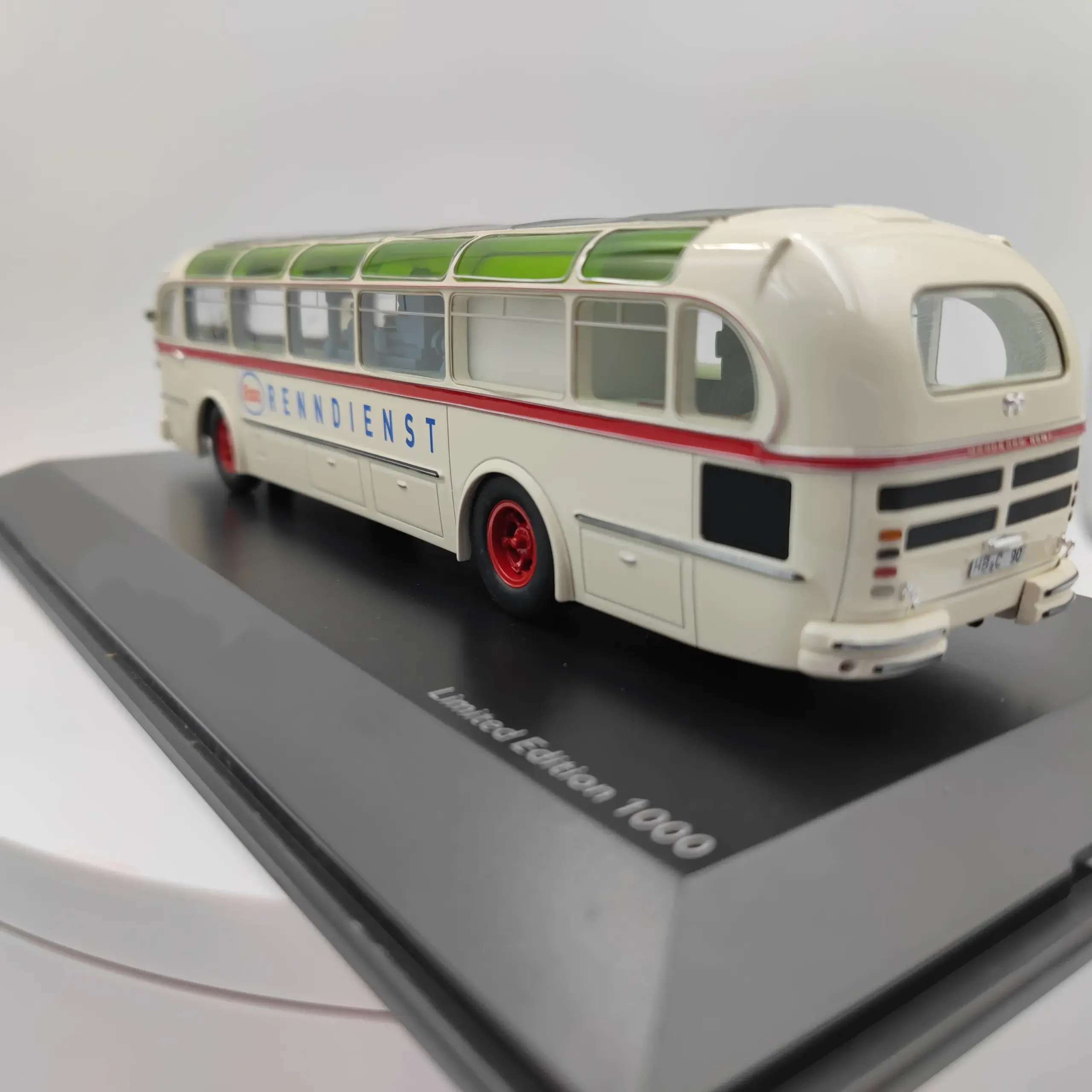 This 1:43 scale diecast model of the Benz O 6600 H Classic Retro Bus RENNDIENST measures 25 cm long, 6.5 cm wide, and 6 cm high. Crafted from alloy metal, it features a vintage-inspired design with a white or cream body, silver framing around large rounded rectangular windows, a gray roof accented with translucent greenish skylights, and a bold red stripe below the windows. The wheels are red with detailed hubcaps, while the front showcases a classic rounded cab with a protruding grille and clear headlights. Suitable for display and collectible purposes only, it is intended for enthusiasts aged 14 and above.