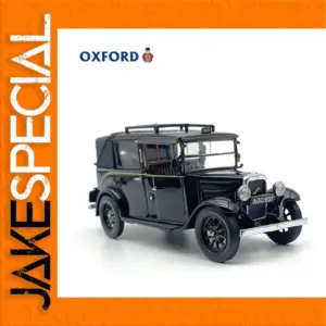 Discover this beautifully crafted miniature of a vintage Austin vehicle, designed in a sleek black finish with a matte or semi-gloss surface. Measuring at 1:43 scale, this diecast model showcases intricate details such as rounded fenders, a boxy passenger cabin, and a roof combining alloy and plastic materials. The front features prominent round headlights flanking a vertical-bared grille in silver or chrome, providing striking contrast. The straight bumper and clear windshield with a black frame enhance its classic look. Small black spoked wheels with thin tires evoke nostalgic charm. Side doors with hinges and slight panel lines add realism, while the roof rack and raised “TAXI” sign reinforce its vintage taxi styling. Overall, a refined collectible for enthusiasts and collectors alike.