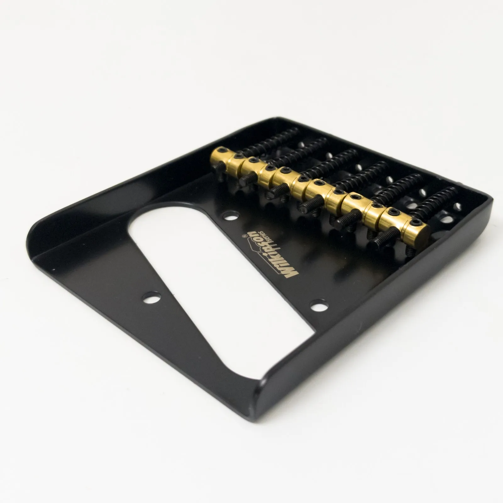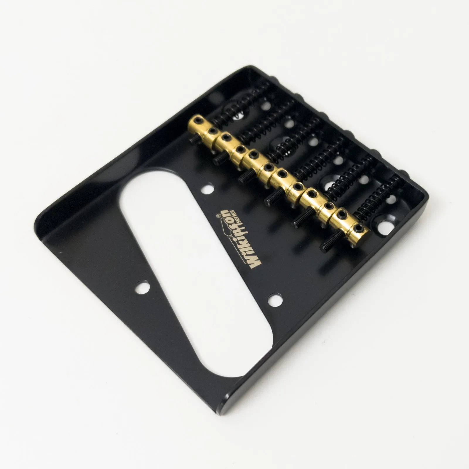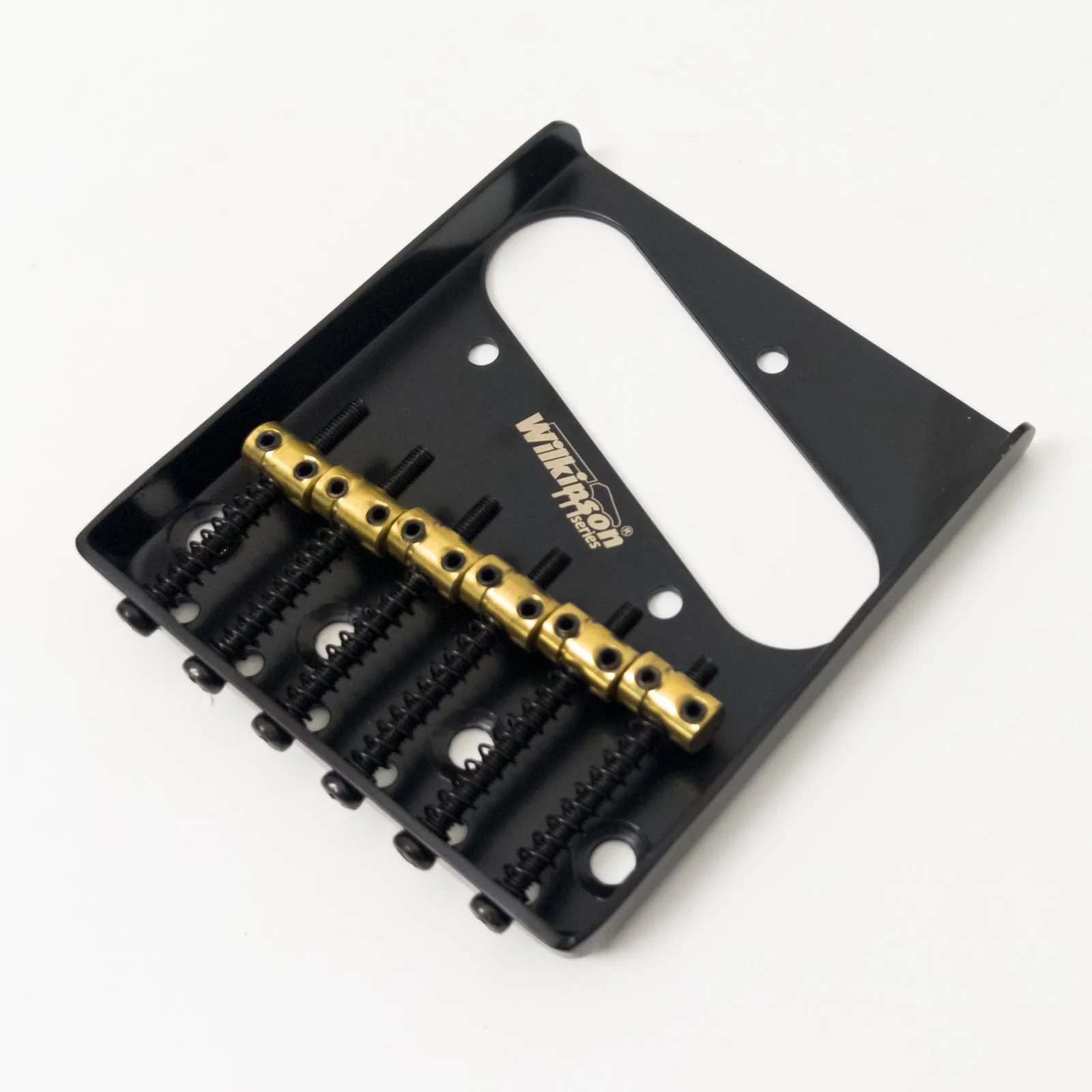 Imagine transforming your Tele-style guitar with this sleek, black metal bridge. Featuring a smooth matte finish, it exudes a modern yet vintage-inspired aesthetic. The six brass barrel saddles add a warm, glowing contrast, with their shiny surfaces catching the light beautifully. Crafted for durability, this bridge combines rugged metallic strength with refined style, offering both visual appeal and functional excellence. Whether you're upgrading your classic or customizing your guitar’s look, this bridge promises to enhance sustain and offer precise string-to-string intonation. Designed to fit perfectly, it seamlessly integrates with your guitar’s body, giving you a reliable, stylish component that will stand out on stage or in your collection. Play with confidence knowing your tone and style are both elevated.