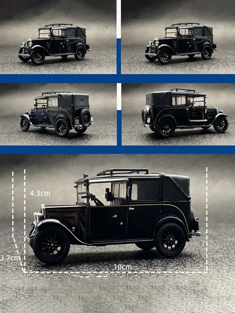 Experience the timeless charm of this vintage-inspired diecast model car, perfectly capturing the elegance of early 20th-century vehicles. Crafted with a glossy black alloy body, this 1:43 scale replica measures just 10 cm long, 3.7 cm wide, and 4.3 cm tall, making it ideal for display and collection. The detailed interior simulation, textured soft-top roof, and vintage accessories like a roof rack add to its nostalgic appeal. The finely crafted side mirrors, door handles, and spoked rims enhance its antique aesthetic. Although non-operational, the model's static design makes it a sophisticated decorative piece or meaningful gift. Its compact size and exquisite craftsmanship appeal to collectors and enthusiasts seeking a classic vintage look.