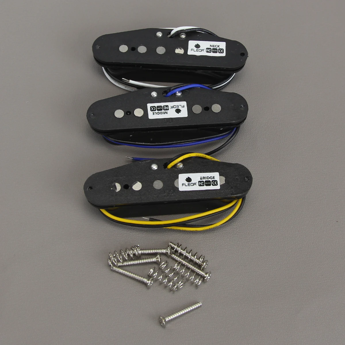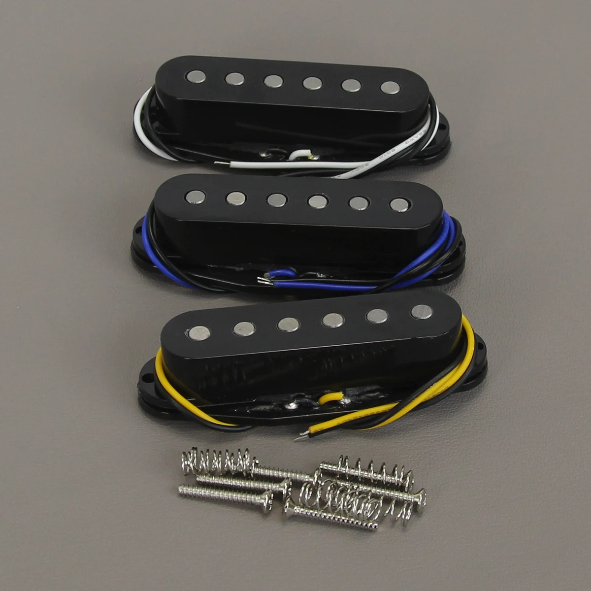 - Each pickup includes PVC wires with distinct color coding: white and black for the neck, blue and black for the middle, yellow and black for the bridge, simplifying installation and wiring adjustments.