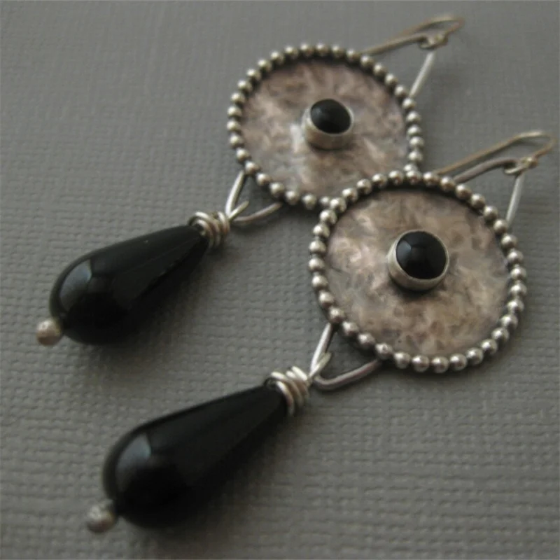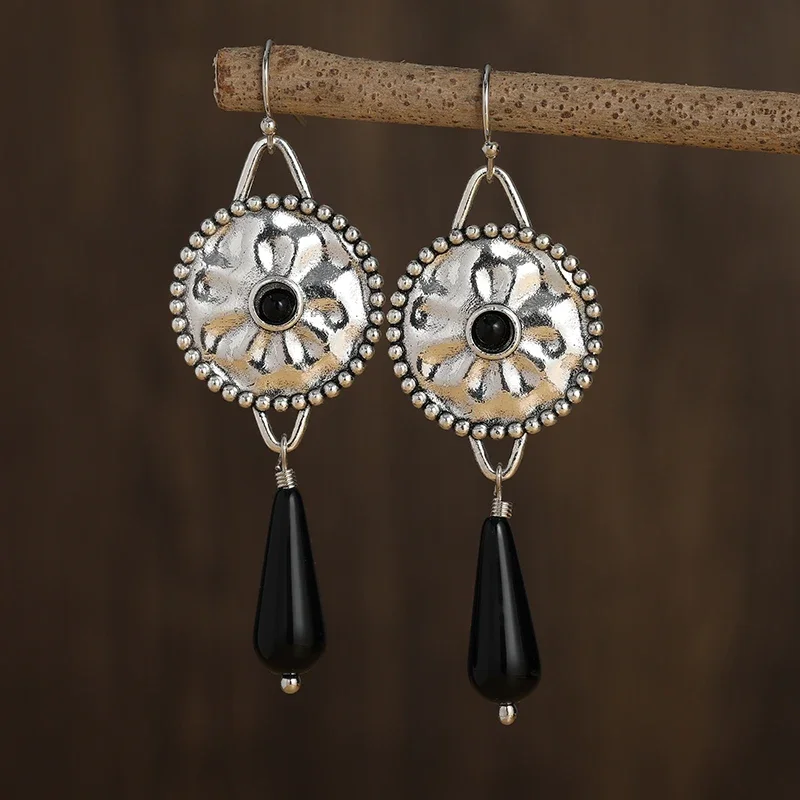 Step into timeless style with these vintage-inspired dangling earrings designed to elevate any look. Crafted from zinc alloy with a sleek silver-colored finish, these earrings feature a captivating geometric design. The round, textured bases resemble natural stone with earthy beige and brown tones, creating a warm, organic feel. Encircled by tiny metallic beads, each base highlights a bold, faceted black stone that serves as a striking focal point. Dangling elongated black teardrop beads add a sophisticated touch, finished with a polished, glossy surface. Perfect for enhancing your outfit for parties, weddings, or daily wear, these luxurious earrings blend ethnic charm with modern elegance, making you feel confident and stylish wherever you go.