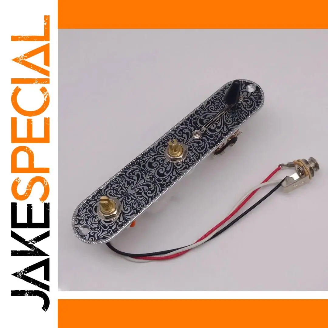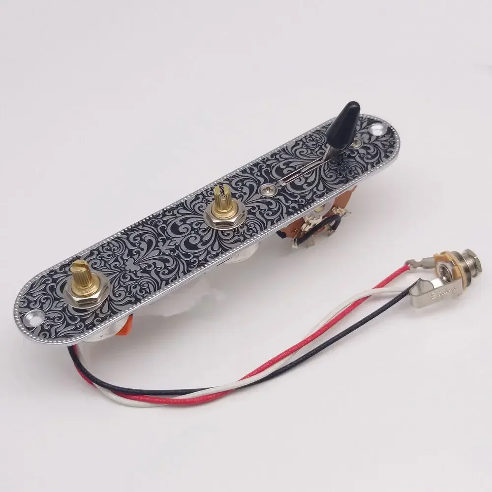 Step into a world of vintage charm and refined craftsmanship with this prewired control plate designed for TL-style electric guitars. Crafted with meticulous attention to detail, it features an ornate black swirling pattern etched onto polished metal, creating a stunning visual contrast with its brass-colored potentiometers and black toggle switch. The control plate’s elongated oval shape measures approximately 33mm wide by 160mm long, fitting perfectly into your guitar’s body. With three mounting holes of about 3mm diameter, including attached screws and a wrench, installation is straightforward. This control plate combines decorative elegance with high-performance electrical components, elevating the aesthetic and functionality of your guitar. It’s an ideal upgrade for musicians seeking both style and superb sound quality.