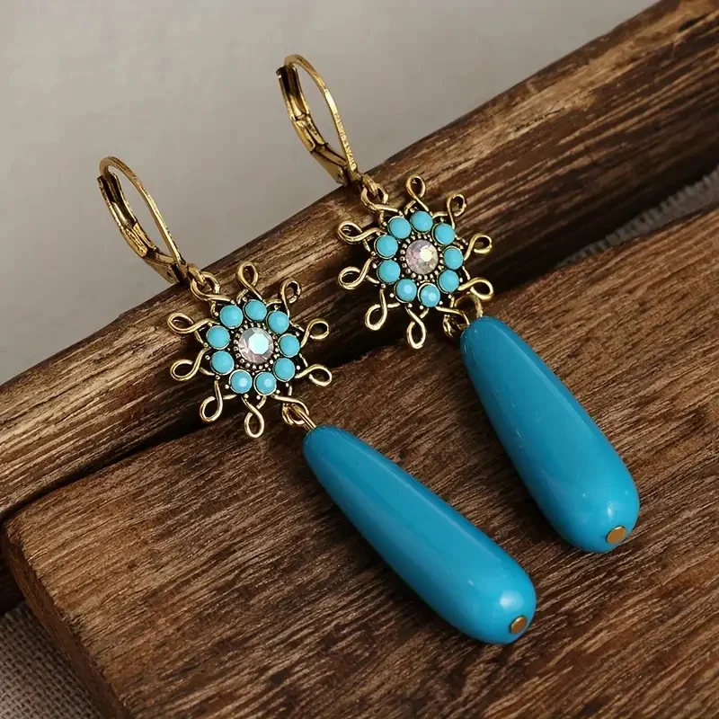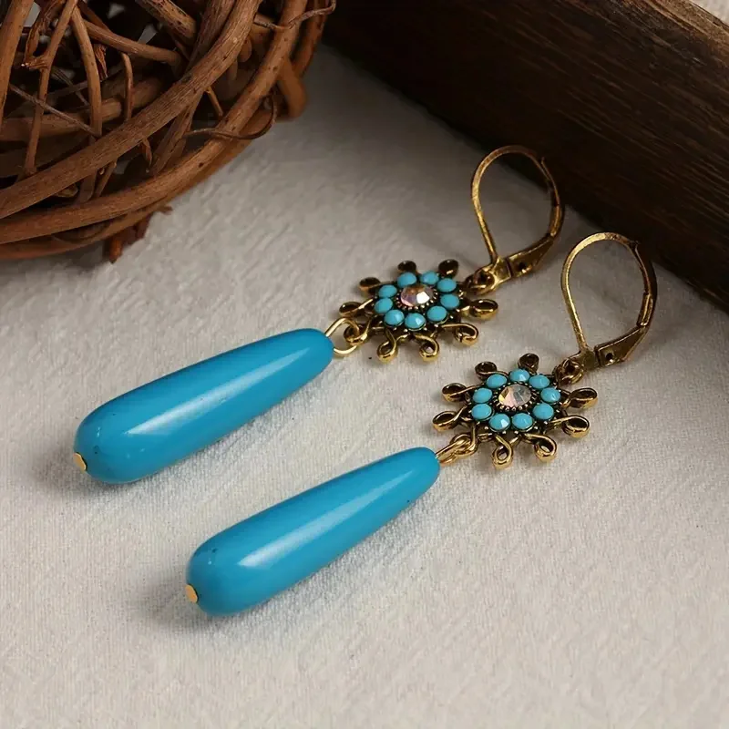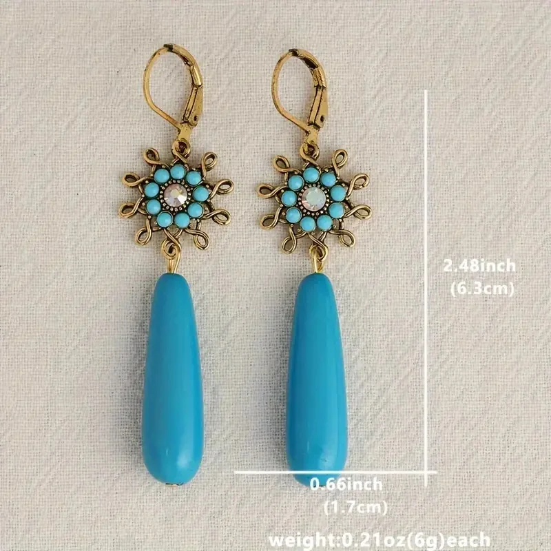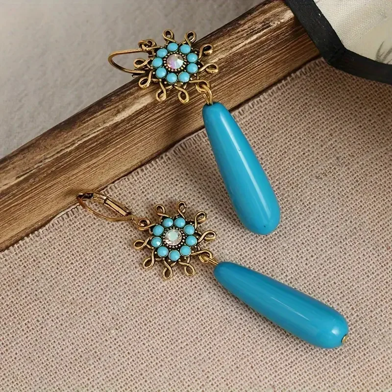 Imagine elevating your style effortlessly with this pair of vintage-inspired drop earrings. Crafted from zinc alloy with a sleek silver or gold finish, they feature a charming geometric floral design. The central gemstone, either clear or white, is surrounded by vibrant turquoise-blue beads that catch the light beautifully. Dangling from this floral motif is a smooth, polished teardrop-shaped pendant in a lively turquoise-blue shade, adding a splash of color and elegance. Perfect for a variety of occasions, these earrings combine timeless vintage aesthetics with modern vibrancy, making them versatile accessories for parties, weddings, or daily wear. Feel confident, radiant, and unique when you wear these eye-catching jewelry pieces.