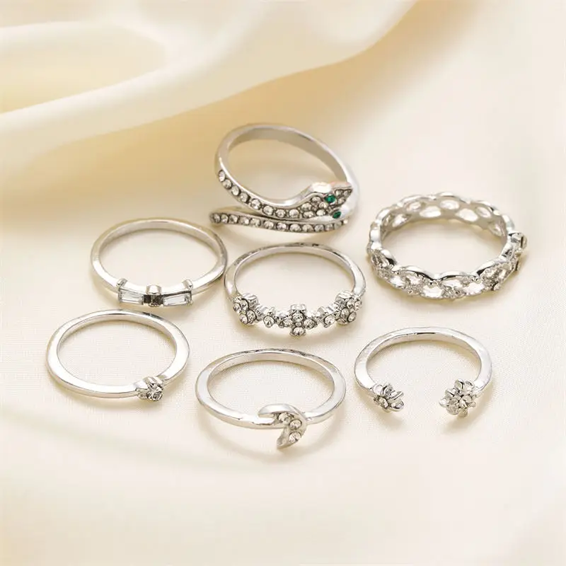 Explore a captivating collection of vintage-style rings designed to elevate your fashion statement. Crafted with zinc alloy and adorned with artificial gemstones, these adjustable rings feature intricate motifs like snakes, moons, stars, and geometric hollow patterns. The set’s silver and gold finishes highlight its bohemian charm, perfect for adding a touch of style to any party or engagement. Each ring measures roughly 2mm in width, with an invisible setting that enhances its shimmering appeal. The textured surface and ornate design elements create a unique, antique-inspired aesthetic that’s both fashionable and versatile. Whether you want to accentuate your everyday look or make a statement at special occasions, this jewelry set offers a charming, eclectic vibe to match your personality.
