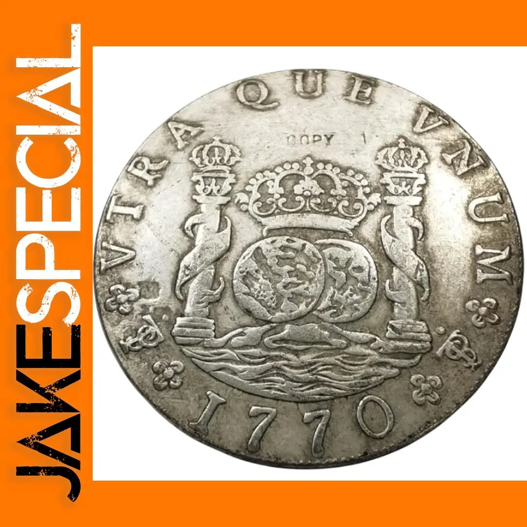 This Bolivia 8 Reales silver replica features a durable metal construction with an antique finish, showcasing dual dates 1769 and 1770. Its intricate craftsmanship reproduces the original design with detailed heraldic symbols, a crowned shield, supporting figures, and ornate motifs, all textured with fine engravings and raised reliefs for a realistic vintage appearance. The piece exudes regal elegance and historical charm, making it an excellent addition to any collection or display. Its engraved background and decorative elements enhance its authentic look, allowing you to appreciate the craftsmanship and history behind this timeless treasure, perfect for collectors seeking a striking, historically-inspired piece.