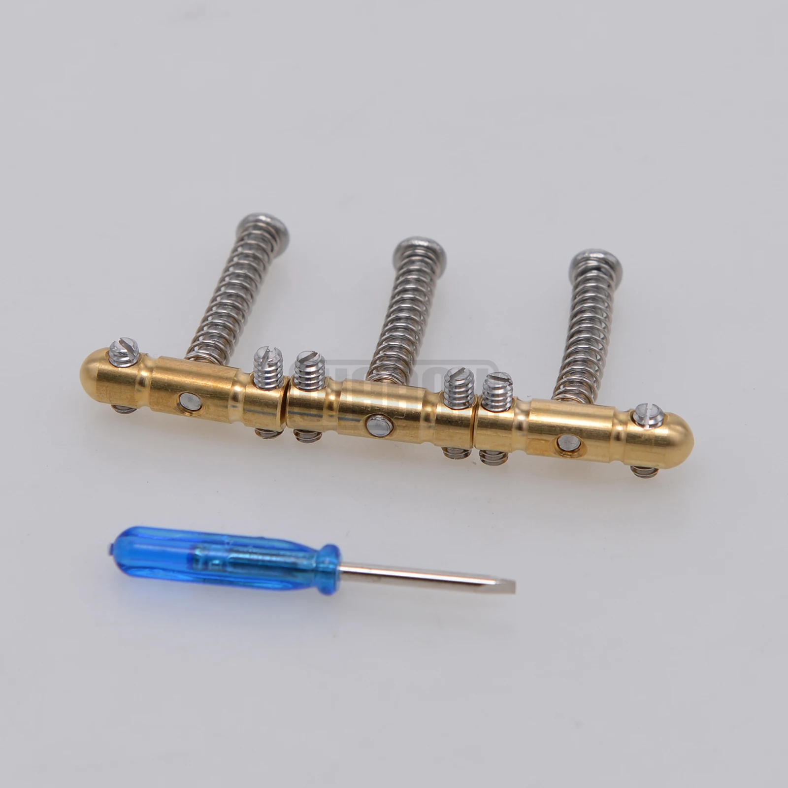 Imagine elevating your guitar’s performance and vintage charm with this set of three solid brass bullet saddles. Crafted to perfectly fit vintage Tele-style bridges, these saddles boast a shiny, golden hue with a polished, smooth finish. Their bullet-shaped, cylindrical form exudes timeless appeal, adding a classic aesthetic to your instrument. Designed for durability, each saddle features precise dimensions for seamless installation and upgraded sound quality. The set allows you to customize your guitar’s action and tone, providing both stability and enhanced sustain. Whether you're upgrading or restoring, these high-quality brass saddles deliver guaranteed performance. Feel confident in your choice to invest in a durable, vintage-inspired upgrade that elevates your guitar's style and sound.