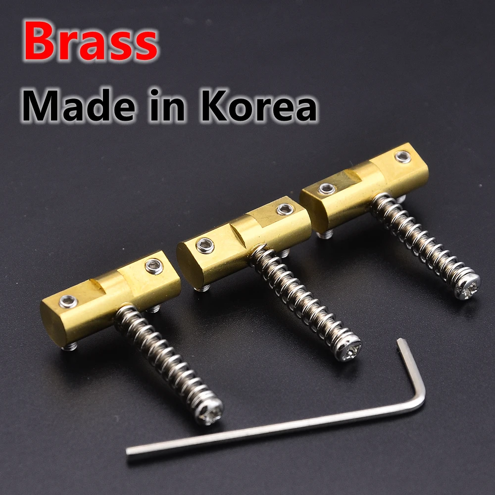 Experience improved tone and stability with this high-quality vintage brass guitar bridge saddle set. Designed with both performance and aesthetics in mind, each saddle features a sleek, rectangular shape with tapered cylindrical ends for easy string placement. The flat top surface includes precise screw holes for effortless mounting, and a central groove securely holds your guitar strings. Available in two stunning finishes—polished, shiny brass with a warm gold hue and a smooth titanium alloy (TC4) with a modern silver tone—these saddles blend timeless style with durability. Weighing approximately 28 grams per set, they provide a lightweight, yet robust solution to enhance your guitar’s sound and playability. Crafted in Korea by GuitarFamily, this set promises quality and longevity.