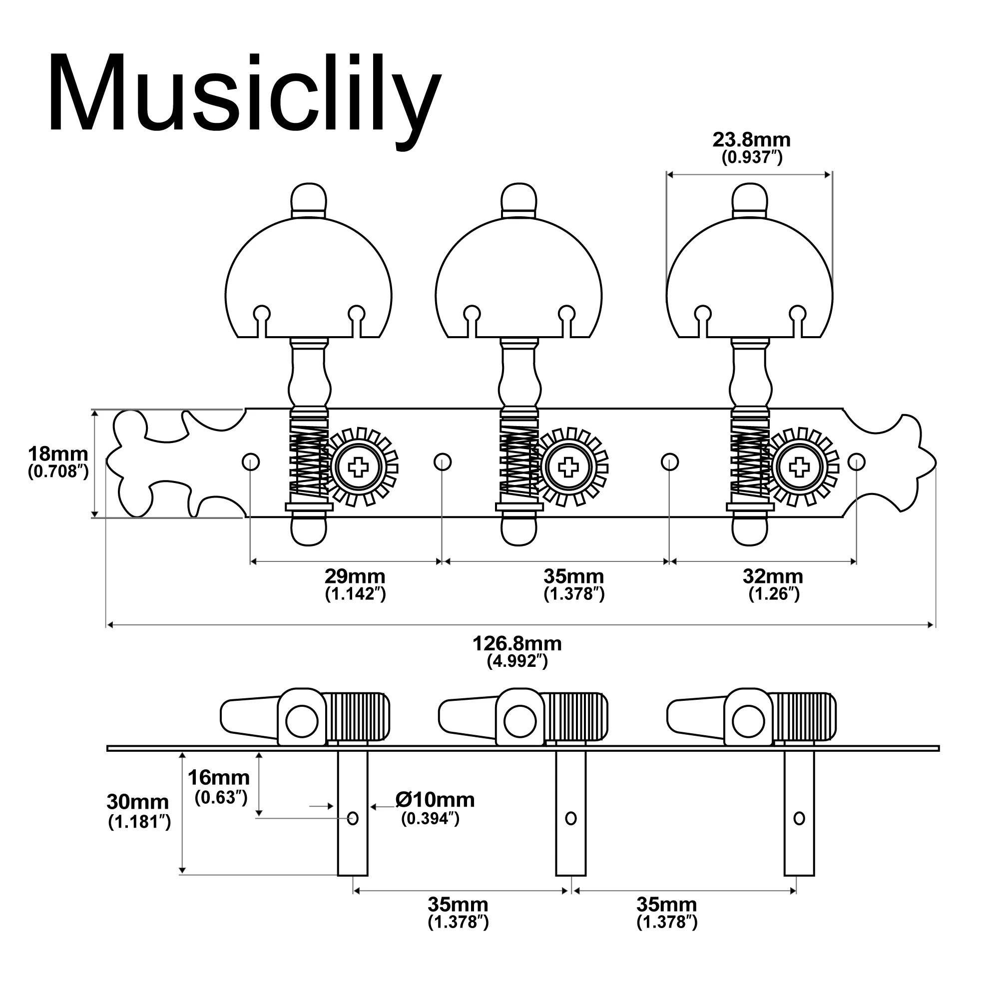 - The components are designed to fit standard 10mm (25/64 inch) peg holes with a 35mm (1-3/8 inch) post spacing, making them compatible with most classical guitars requiring bouchet style tuners.