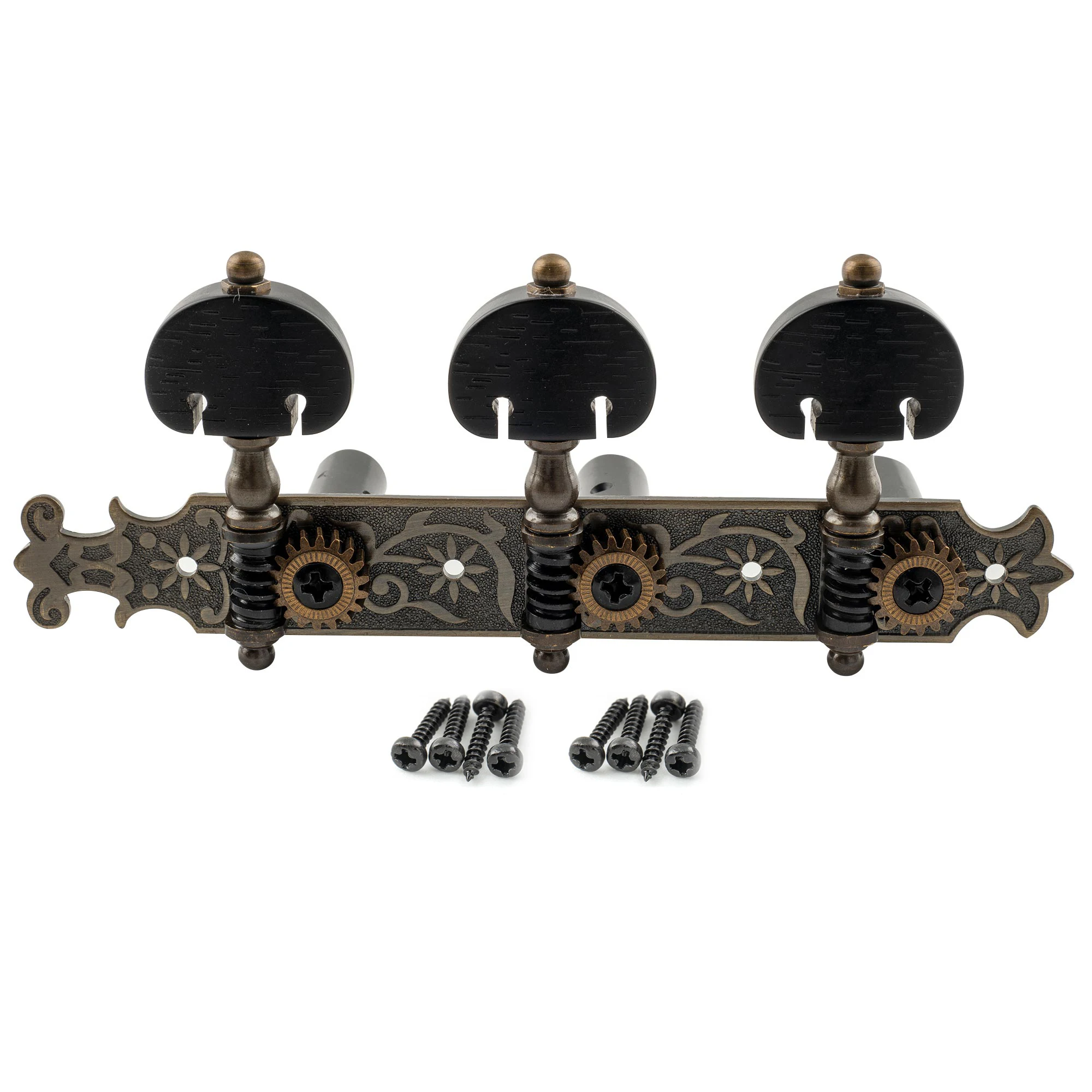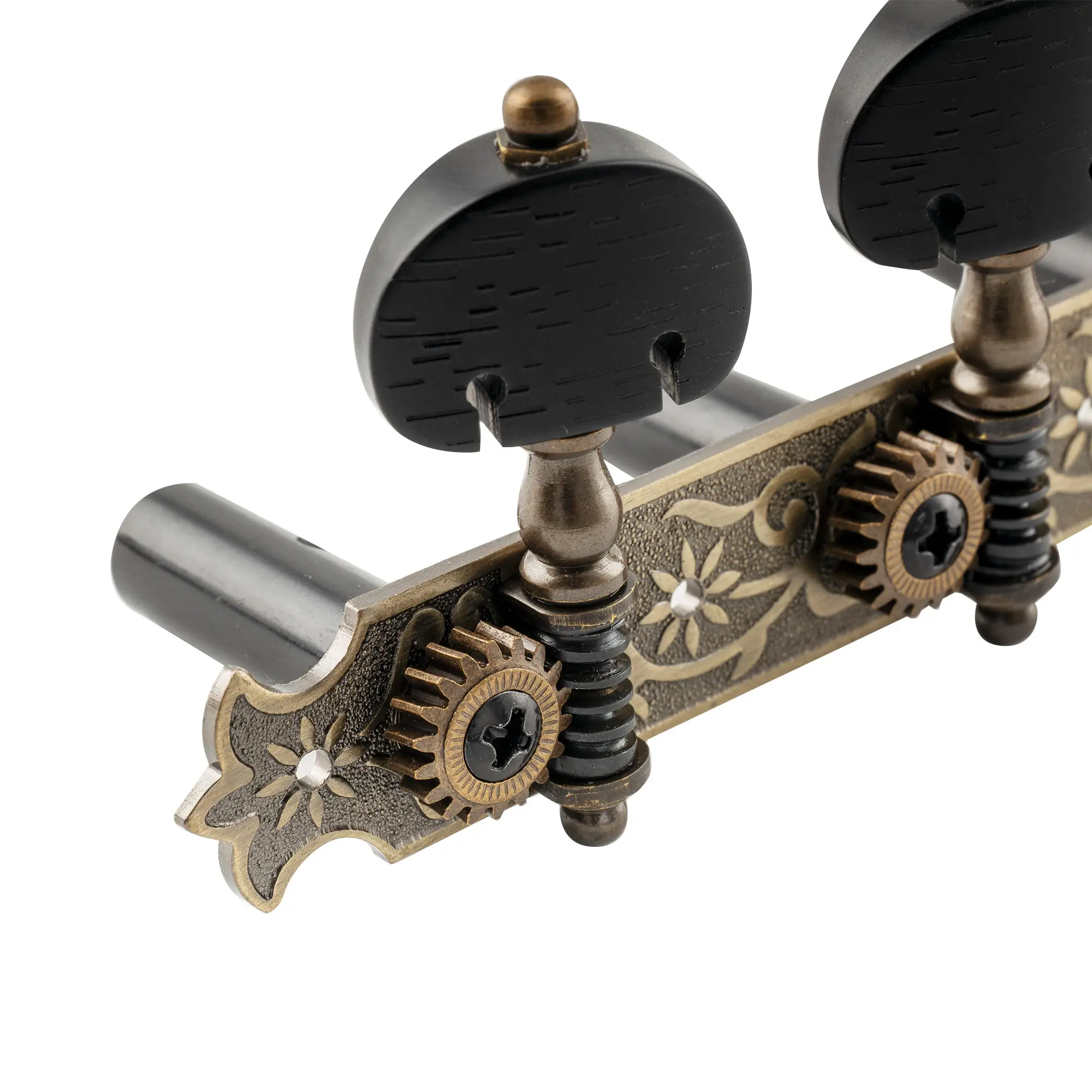 Step into the world of classic music with this beautifully crafted set of classical guitar tuners, designed to elevate your instrument's aesthetic and performance. Featuring an ornate antique brass finish, these tuner machines exude a vintage charm, with intricate engravings and detailed ornamentation on the mounting plate. The sleek black plastic knobs add a modern contrast, creating a perfect blend of old-world elegance and contemporary design. Built with durable metal alloy components, these tuners promise reliable tuning stability and precise adjustment thanks to their 18:1 gear ratio. Designed to fit standard 10mm peg holes and a 35mm post spacing, they’re an ideal upgrade for your classical guitar. With all necessary mounting accessories included, installing them will be seamless and straightforward.