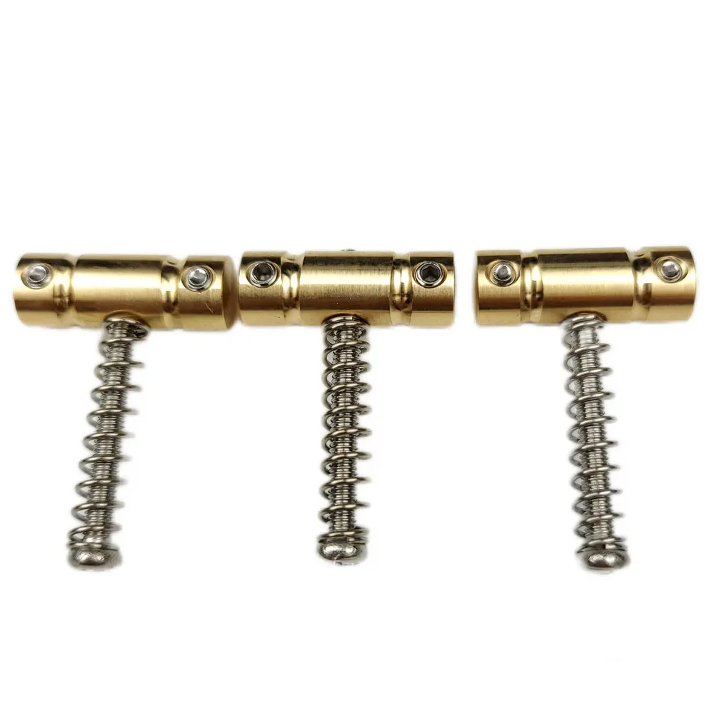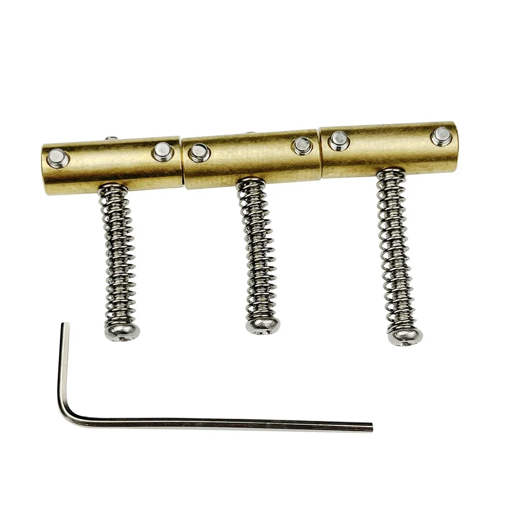Enhance your Telecaster electric guitar with this set of three vintage-style compensated brass bridge saddles, each measuring 10.8mm in length. Crafted from durable metal, these saddles feature a warm brass finish that highlights their classic, timeless appeal. The rectangular design includes visible grooves or slots for string placement, providing both functionality and vintage charm. Compatible with Telecaster models, the set includes three shiny metal screws and a silver-colored hex key for easy adjustment and installation. Available in two distinct styles, Style A and Style B, these saddles combine durability, utility, and a vintage aesthetic to give your guitar a refined, authentic look and sound.