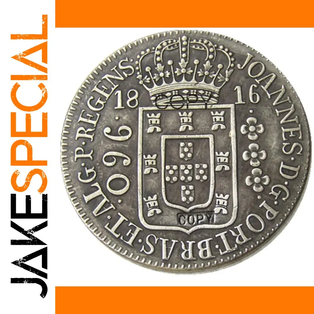 This stunning replica coin from Brazil, dated between 1920 and 1939, captures a nostalgic vintage aesthetic. Crafted from metal with meticulous attention to detail, this coin showcases a textured, ridged edge reminiscent of classic currency. The metallic silver surface features subtle shading variations, emphasizing depth and craftsmanship. The front face displays a highly detailed coat of arms at the center, including a shield with five smaller shields arranged in a cross pattern, each filled with multiple dots. Above this, a regal crown adorned with floral motifs and arches adds a sense of royal elegance. Around the edges, inscriptions like “JOANNE D. G. PORT. BRASIL”, “AL. G. P. REGNER”, and the year “1816” evoke a historic, patriotic theme. Its antique finish and sharp engravings make it an ideal collector’s item for enthusiasts of nostalgic, vintage memorabilia.