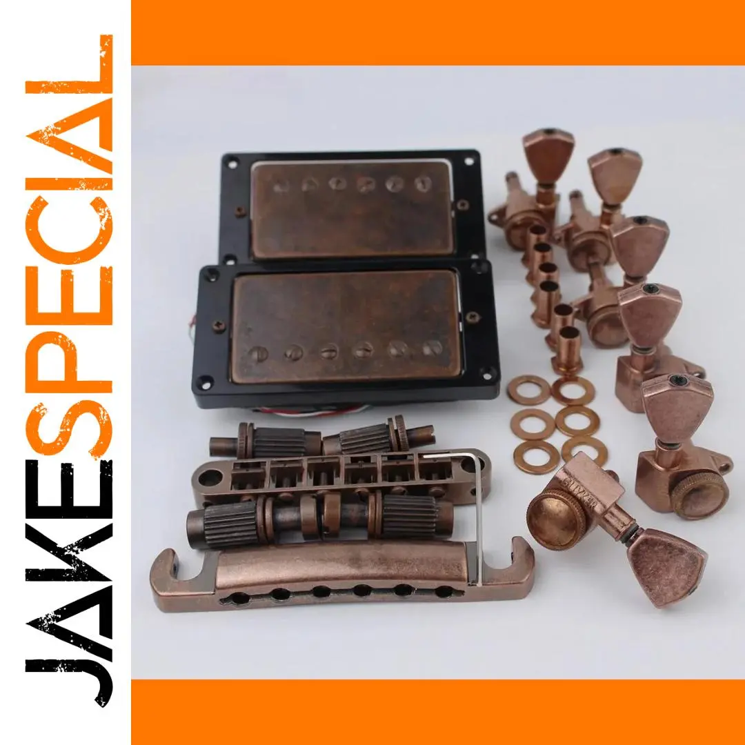 Imagine enhancing your guitar with this beautifully crafted bronze hardware set, designed to bring a rich, vintage aesthetic to your instrument. The warm metallic finish, with its slightly aged and worn look, exudes timeless charm and craftsmanship. Perfect for LP-style guitars, this set includes essential components like pickups, tuners, a string lock, and an “O Matic” tune system, all meticulously made of durable metal. Whether you're restoring a classic or customizing your guitar, these components will elevate your tone and style. The intricate details and antique-inspired design add character and a personal touch, helping you achieve that perfect vintage sound and look. This set truly combines functionality with retro elegance.