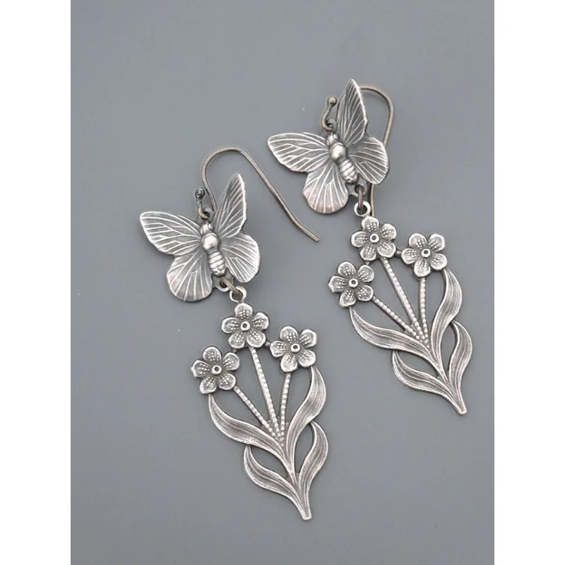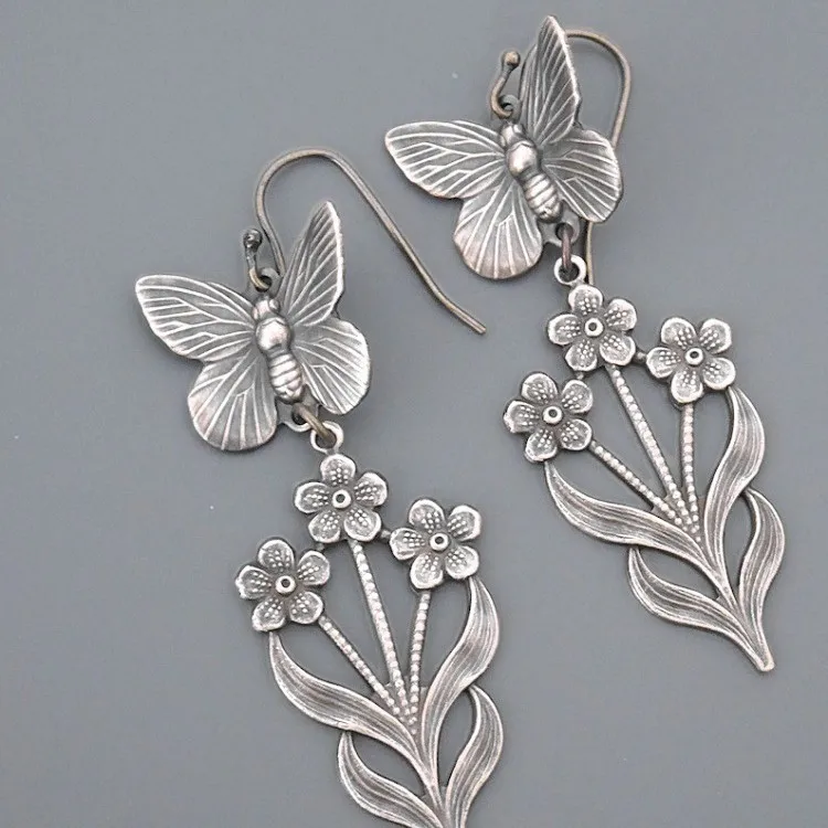 Experience the timeless charm of these vintage-inspired dangle earrings, designed to elevate your style for any occasion. Crafted from zinc alloy, they feature intricate butterfly motifs at the top with textured, veined wings that exude delicacy and realism. Hanging below are charming floral elements with five rounded petals, dotted centers, and short textured stems, creating a rich, ornate look. A graceful, curved leaf shape completes the overall design, adding a flowing elegance. Finished in polished silver or gold colors, these earrings seamlessly blend classic beauty with modern craftsmanship. Lightweight yet durable, they promise comfort for daily wear or special events. Visualize yourself wearing these stunning pieces, enchanting everyone with your refined style.