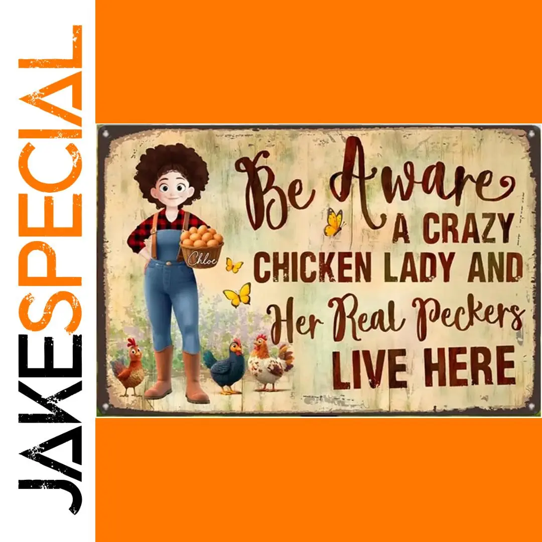 Imagine decorating your space with this delightful vintage-style metal sign that exudes rustic charm. Featuring a playful cartoon illustration of a cheerful young woman with large, curly brown hair, dressed in a red and black checkered shirt and blue overalls, it captures a whimsical country vibe. She’s smiling warmly while holding a basket labeled “Chloe,” surrounded by lively chickens in shades of brown, white, and a red-combed rooster. Yellow butterflies flutter nearby, adding a touch of whimsy. The weathered background with a distressed finish enhances its vintage appeal. In playful cursive and bold block fonts, the sign reads, “Be Aware A Crazy Chicken Lady And Her Real Peckers Live Here,” perfectly suited for chicken or farm lovers seeking humorous home decor. This sign creates a warm, inviting atmosphere that celebrates country life and humor.