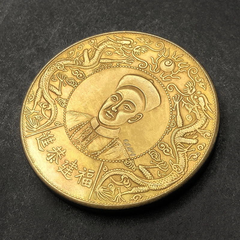 Step into cultural elegance with this stunning vintage Chinese gold replica. Measuring 40mm in diameter, it is crafted from durable copper featuring a polished, vibrant gold-tone finish that highlights every intricate detail. The centerpiece showcases a finely carved portrait of a figure dressed in traditional attire, with detailed facial features, ornate headgear, and elaborate clothing patterns that reflect cultural heritage. Surrounding this central figure are majestic Chinese motifs, including sinuous dragons with sharp claws and expressive faces, swirling clouds or flames, and celestial symbols, all carved with remarkable depth and precision. An elegant beaded border finishes the design, while the textured patina adds nostalgic vintage charm. Its handcrafted imperfections make each piece unique, perfect for collectors or cultural enthusiasts seeking authentic aesthetic appeal.