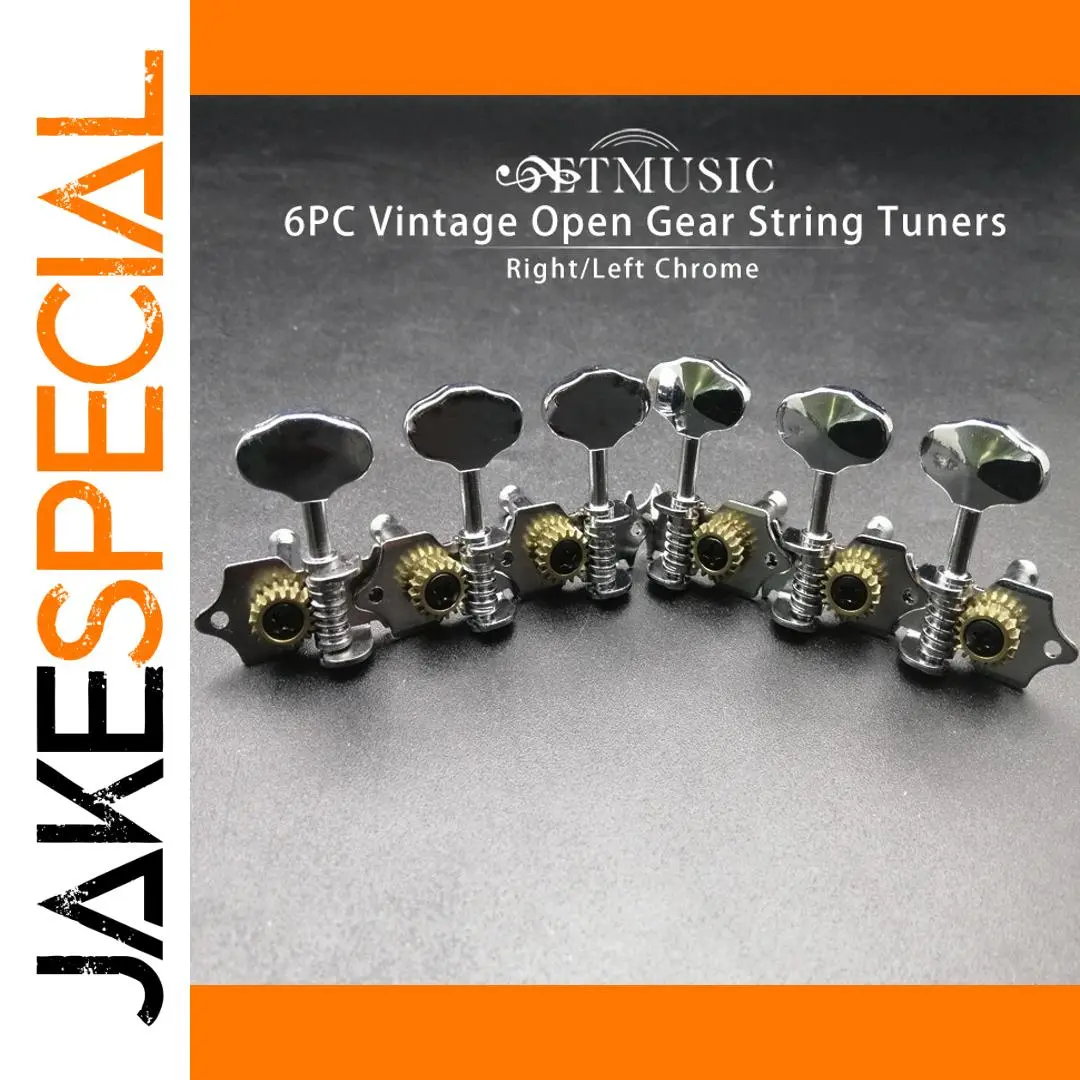 Experience the timeless elegance of these high-quality vintage chrome tuning pegs, designed to elevate your acoustic guitar or ukulele to a new level of craftsmanship. Crafted from durable metal with a polished chrome finish, these tuning machines boast an open gear design with striking gold-toned gears that provide a classic, retro aesthetic. The flat, glossy knobs with a slightly rounded top offer a comfortable grip and a refined look. Whether you're restoring an instrument or customizing a new build, these tuning pegs will seamlessly blend functionality and vintage style, ensuring smooth tuning adjustments and a reliable hold for strings of all gauges. Perfect for musicians seeking a combination of visual appeal and performance.
