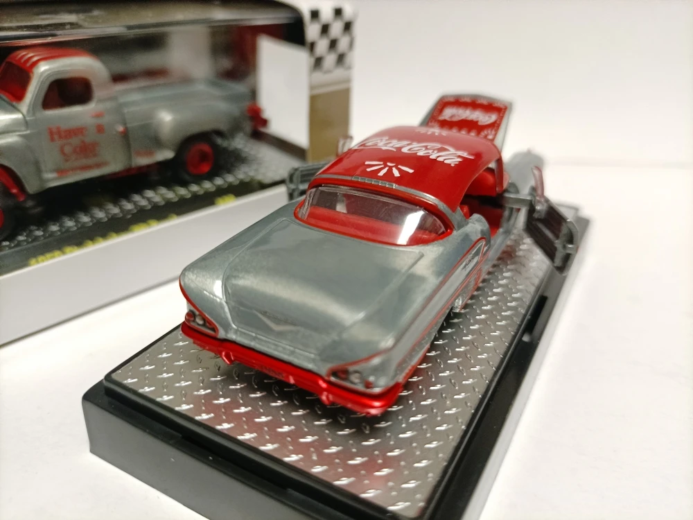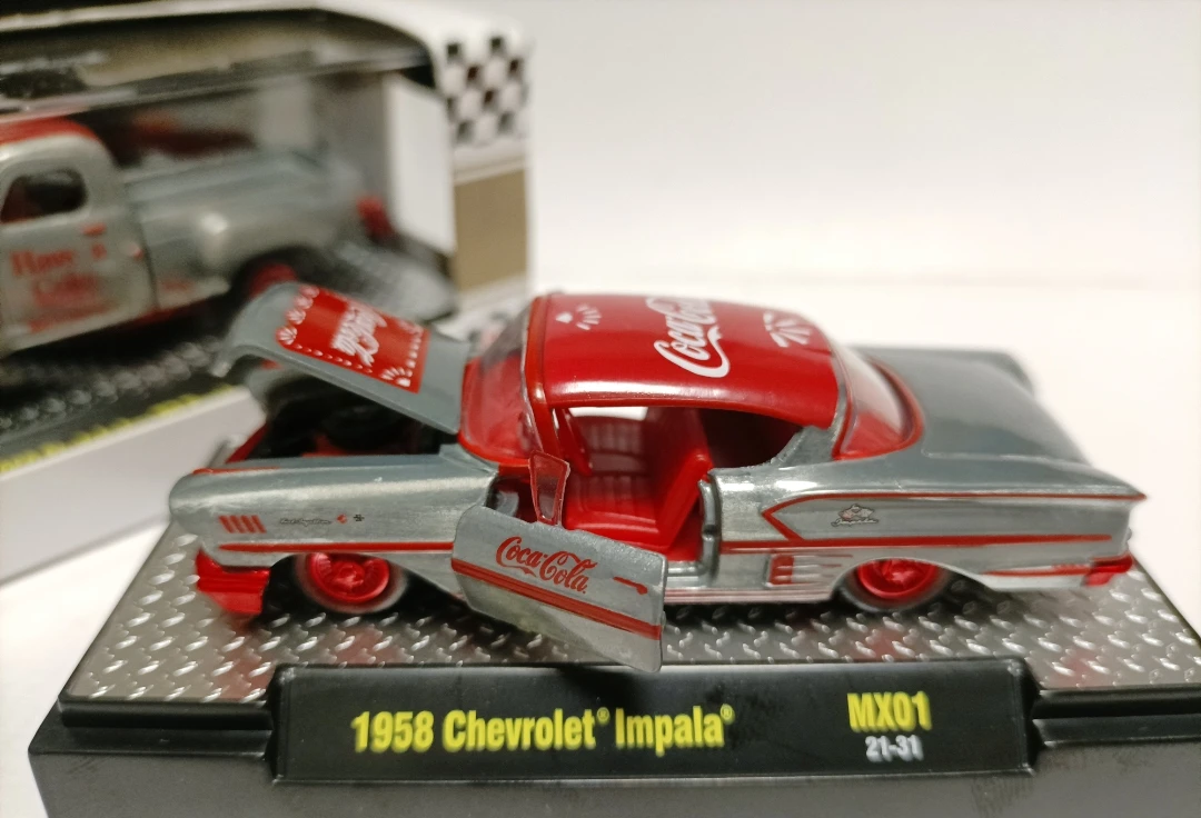 Imagine owning this beautifully crafted 1:64 scale diecast model of the iconic Chevrolet Impala Deluxe Sedan. Its vintage-inspired design features a sleek silver body with a weathered Coke wash paint finish, giving it a nostalgic, aged look perfect for display. The bright red roof proudly displays the Coca-Cola logo, while matching side doors enhance its retro promotional charm. The model showcases classic 1950s styling with rounded edges, tailfins, detailed headlights, grille, and bumper for authentic realism. The alloy diecast construction ensures durability and a premium feel. Whether you’re a collector or enthusiast, this model offers a striking addition to your collection, captivating viewers with its craftsmanship and vintage aesthetic.