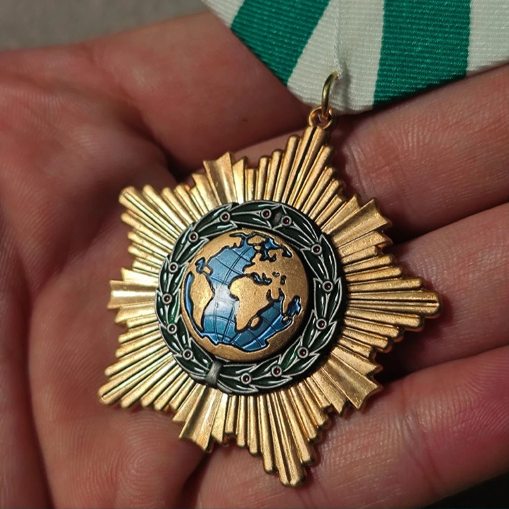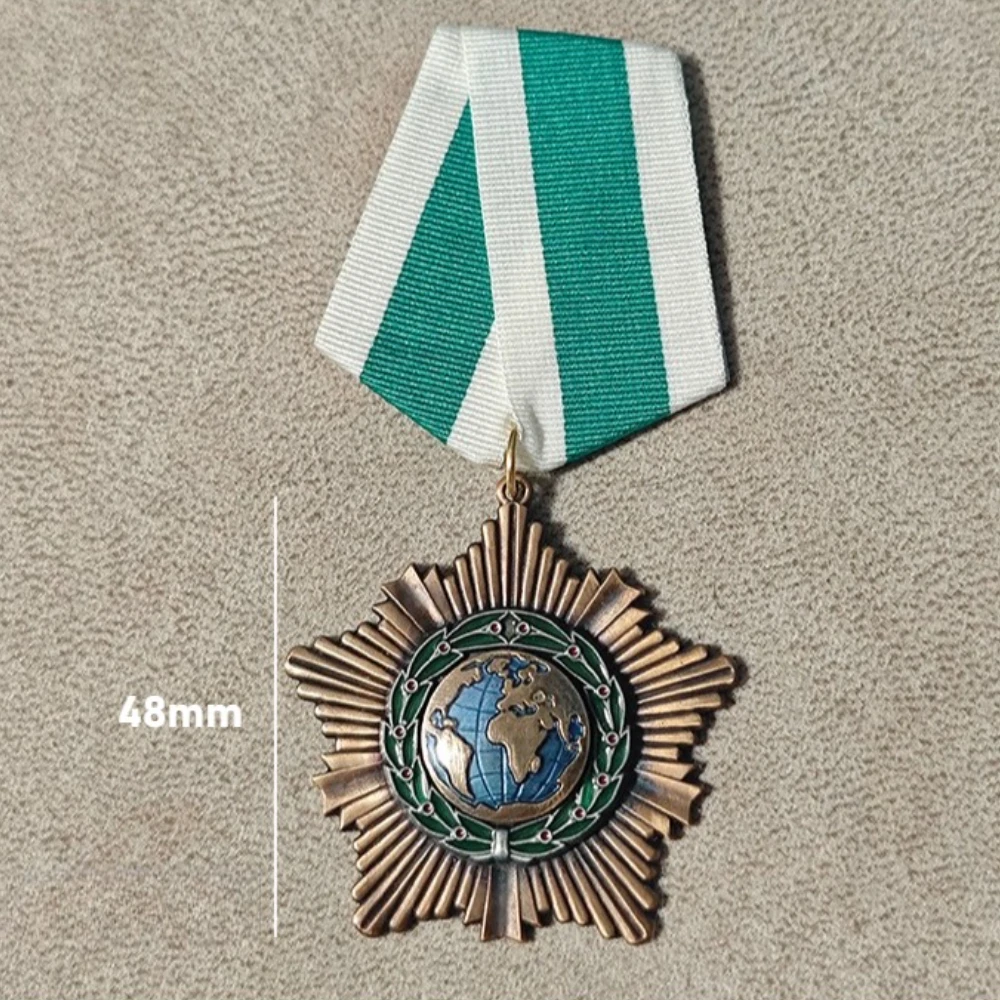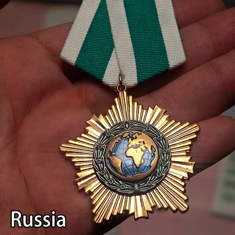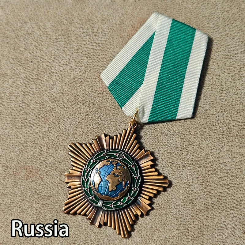 Imagine adding a distinguished piece of European history to your collection with this beautifully crafted medal. The Order of Friendship of the Russian Federation medal features a vintage copper hue, giving it an authentic antique look that evokes nostalgia and timeless craftsmanship. Its detailed, star-shaped emblem radiates elegance and depth, complemented by a circular band showcasing a beautifully illustrated Earth in blue and beige tones. The encircling green laurel wreath symbolizes achievement and honor, making it a meaningful collectible. Attached to a textured white ribbon with bold green stripes, this medal offers a perfect combination of artistry and symbolism. Its durable copper construction ensures it remains a prized addition to your collection for years to come, highlighting your appreciation for historical craftsmanship.
