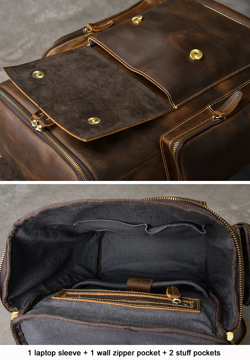Imagine yourself effortlessly standing out in the crowd with this Vintage Crazy Horse Genuine Leather Backpack. Crafted from genuine cow leather in a rich dark brown color, it not only exudes sophistication but also promises durability and a timeless appeal. Measuring 42cm in height, 29cm in width, and 16cm in thickness, the bag has a generous capacity of 20-35 liters, making it perfect for both outdoor adventures and daily commutes. With ergonomically designed arcuate shoulder straps and multiple pockets, including a laptop sleeve for 15″ to 17″ laptops, you’ll organize your essentials with ease and style.