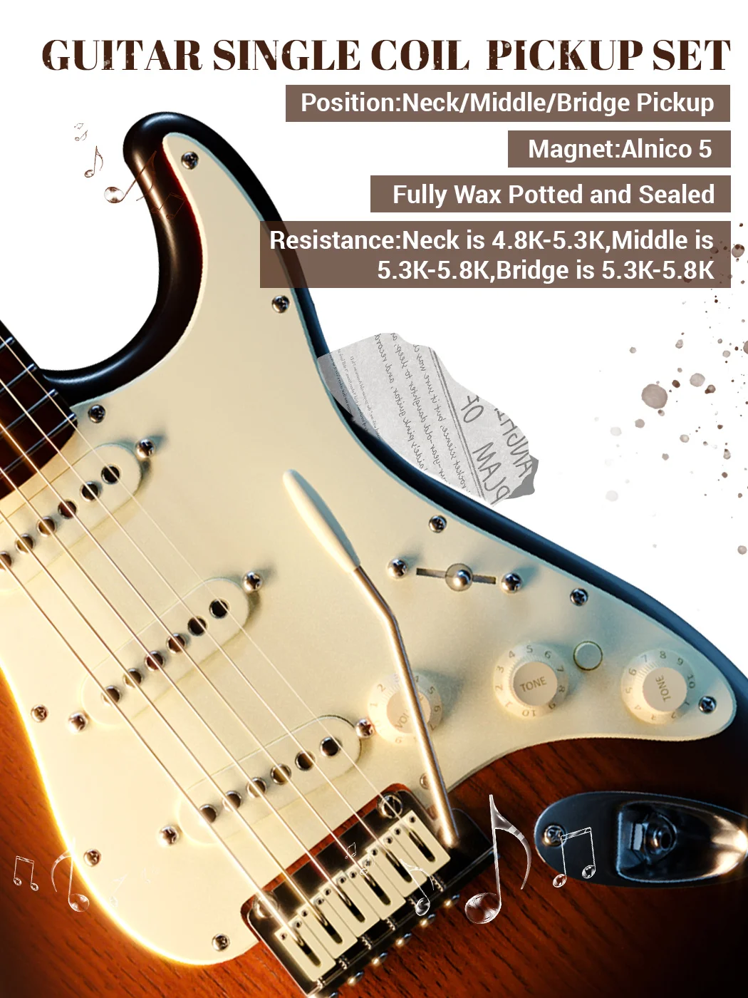 - Includes three passive pickups compatible with Stratocaster style guitars, with resistances of 5.6KΩ for neck and middle, and 7.2KΩ for bridge, optimized for versatile tones.