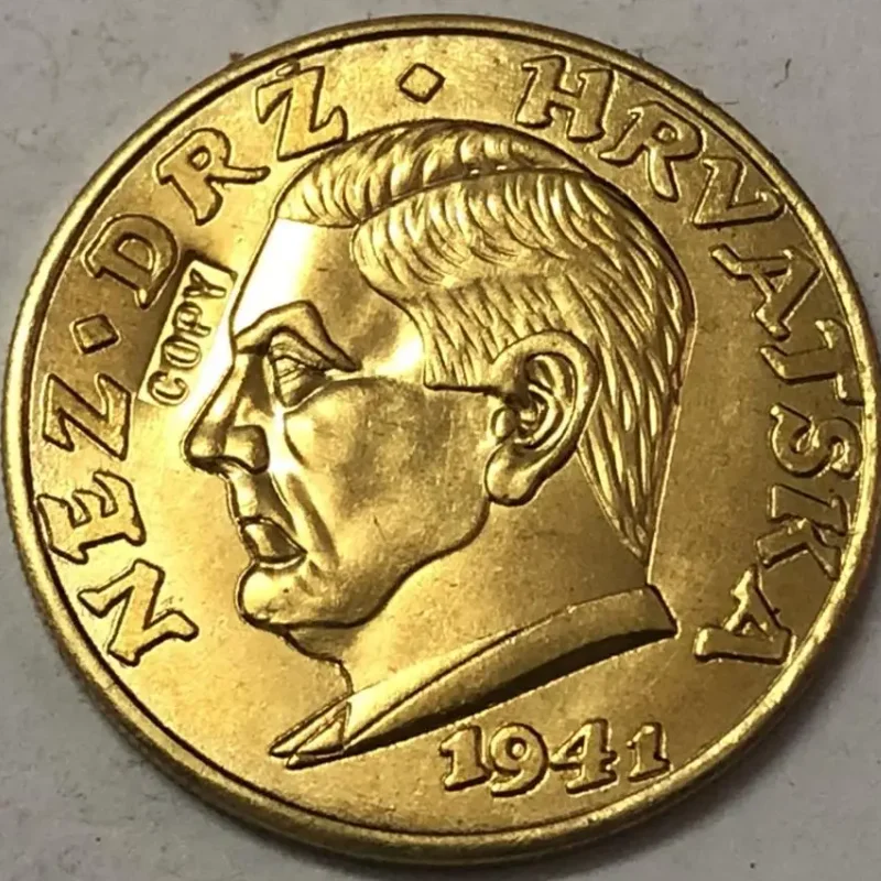 Immerse yourself in history with this beautifully crafted replica of the 1941 Croatia 500 Kuna coin, featuring Ante Pavelic. Made from metal with a polished, shiny gold-tone finish, it captures the vintage European charm of the original wartime currency. The coin’s detailed raised portrait of Pavelic shows his facial features, glasses, and neatly styled hair with fine lines highlighting the craftsmanship. The embossed inscription “NEZ Z D Z HRVATSK” curves elegantly around the upper edge in bold, antique-style font. At the bottom, the clear, embossed year “1941” adds to its authentic appearance. This cast imitation is perfect for collectors interested in European history or antique memorabilia, offering a nostalgic and historic feel. Its intricate relief work and vintage design make it a striking addition to any collection or display.